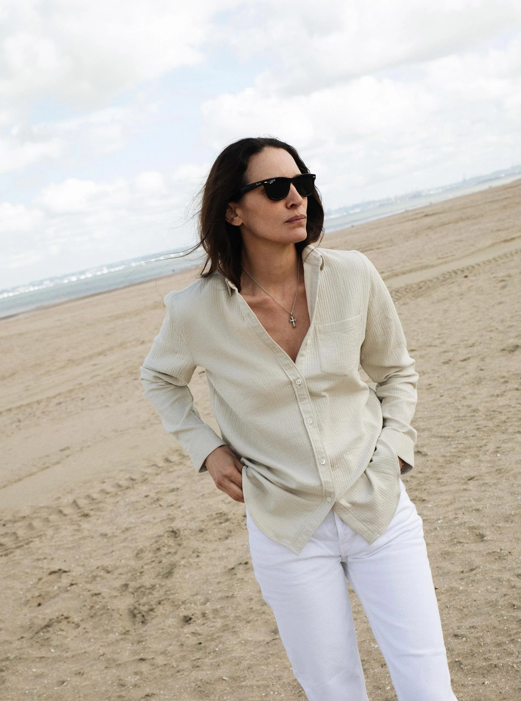 La chemise Ada est réalisée en 100% gaze de coton douce, plus épaisse que nos autres chemises. Elle offre une texture douce et chaleureuse, idéale pour la mi-saison. Sa coupe droite légèrement oversize dessine une silhouette décontractée, élégante et facile à porter. Polyvalente, elle peut aussi se porter en surchemise.