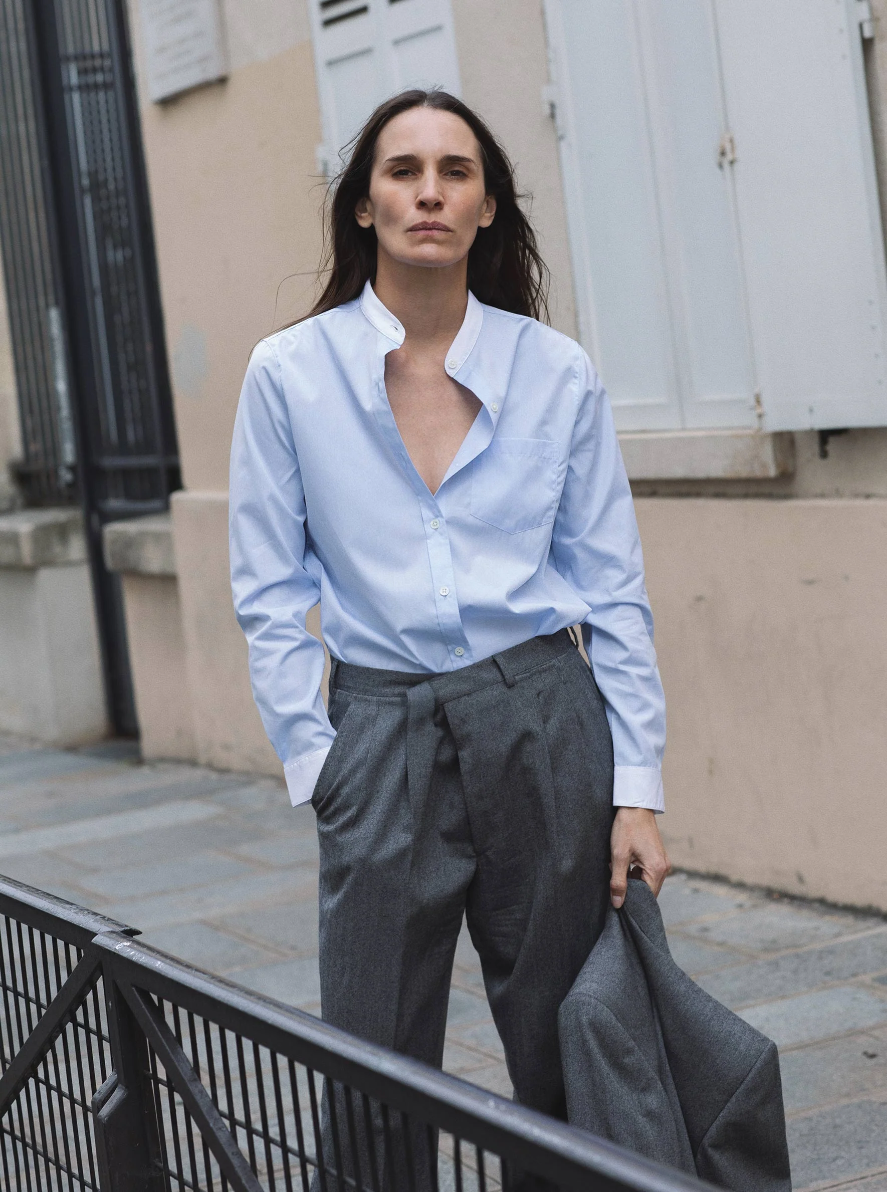 Épurée et structurée, cette chemise à col officier incarne l’essence de Marie Marot — une pièce intemporelle, inspirée du vestiaire masculin et pensée pour toutes les femmes.