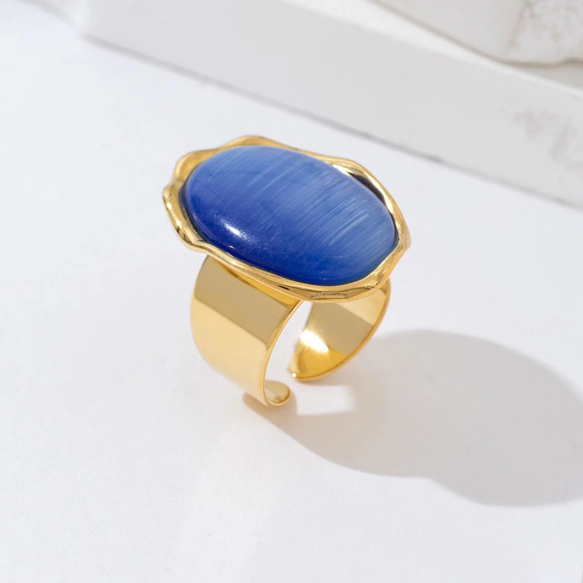 Bague dorée en acier inoxydable avec pierre ovale colorée