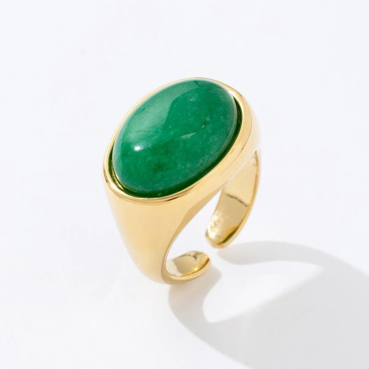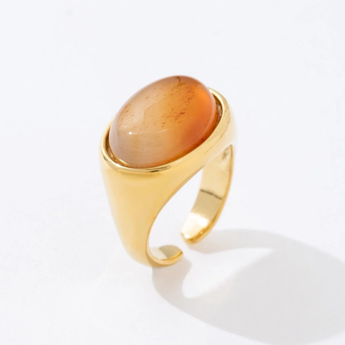 Conçue en acier inoxydable doré, cette bague ne ternit pas et résiste à l’eau, tout en restant hypoallergénique. Sa monture épaisse et brillante met en valeur la pierre ovale centrale, qui capte la lumière et apporte une touche colorée et sophistiquée.