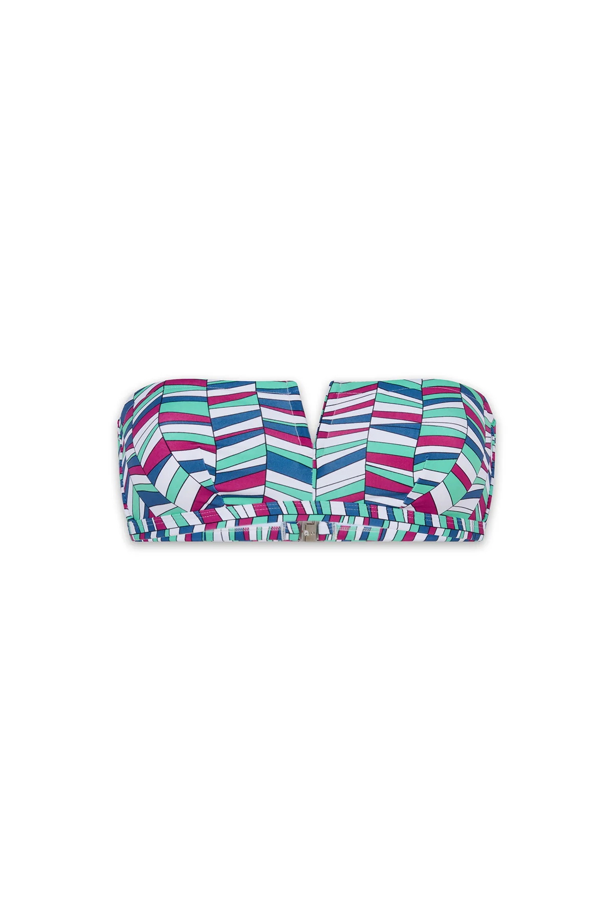 Un bandeau imprimé vert et fuchsia, élégant et qui maintient bien la poitrine (convient à tous les bonnets).