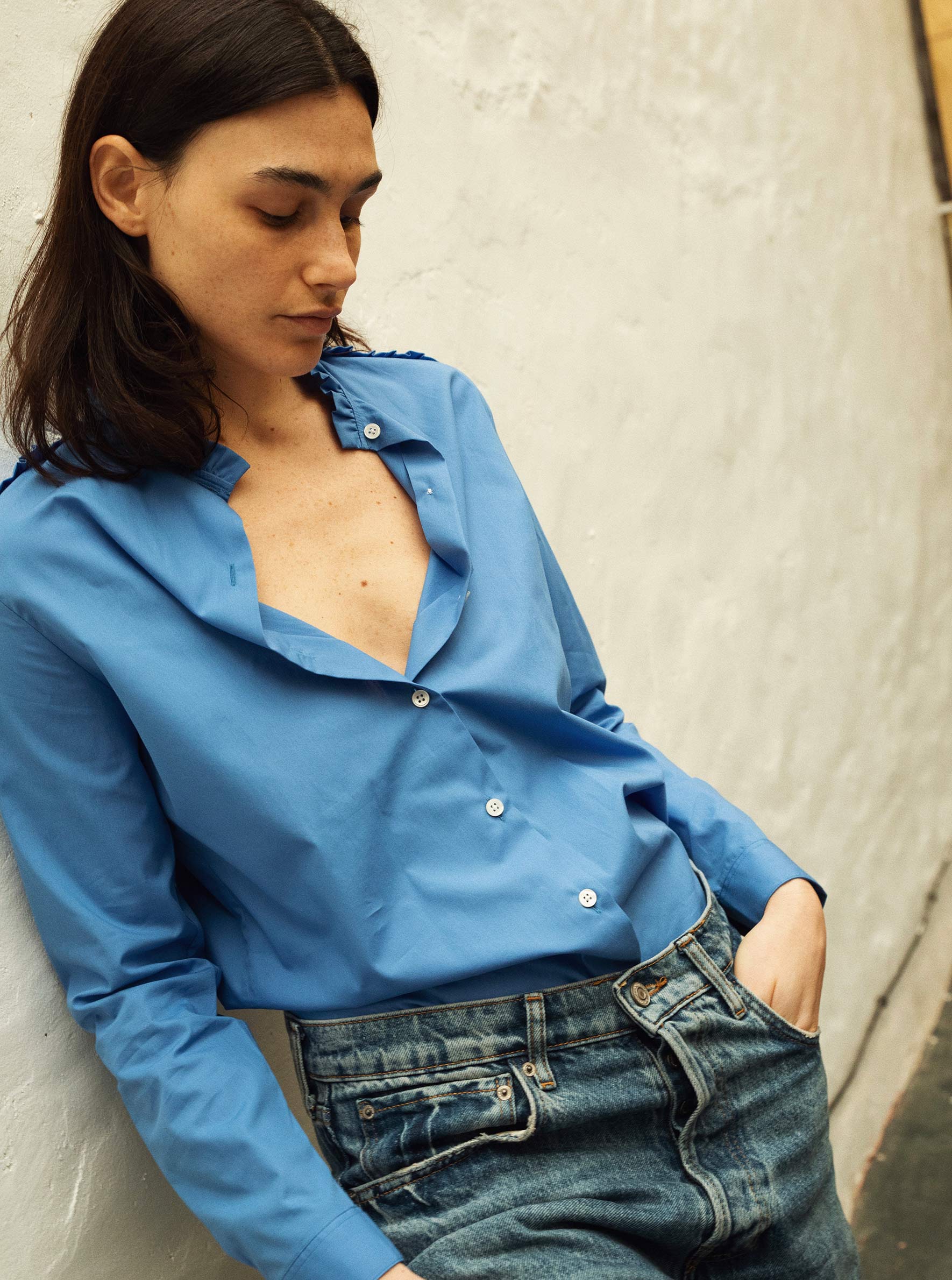 Notre modèle iconique est de retour! Chemise coupe droite légèrement oversize Col et épaules à volants Composition 100% coton – Lavage en machine à 30°C Esther porte une taille S (4/6 US)