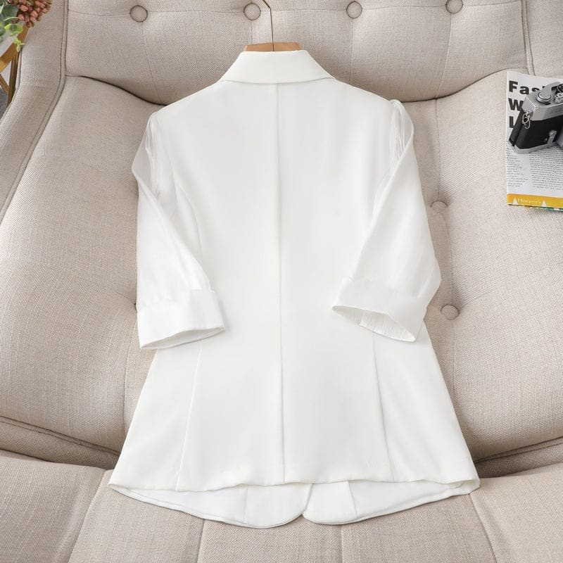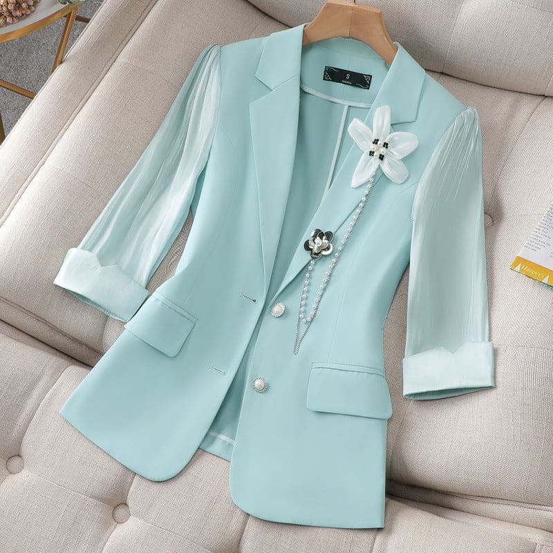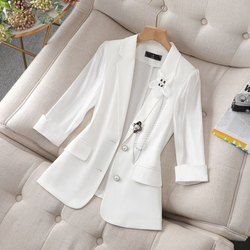 Un blazer à manche ¾, fermé par deux boutons, une broche décorative en forme de petite fleur, reliée par un fil de perles. Ce blazer se superpose parfaitement à tous types de vêtements. Celui-ci a un style très raffiné avec son col tailleur ainsi que des poches à rabat. Il est disponible en blanc, en jaune et bleu.
