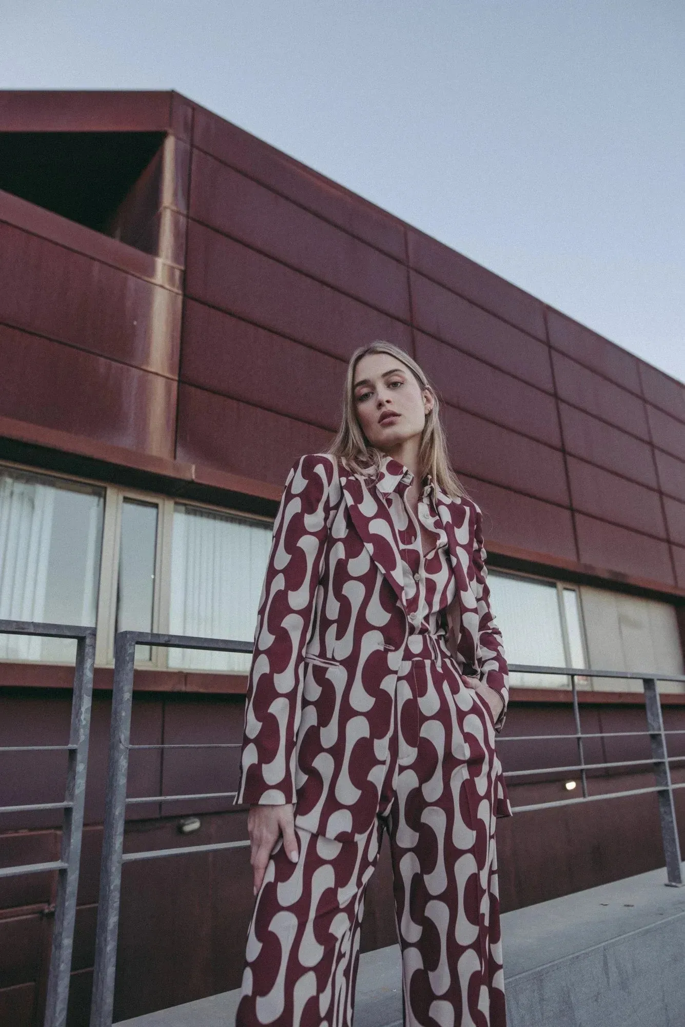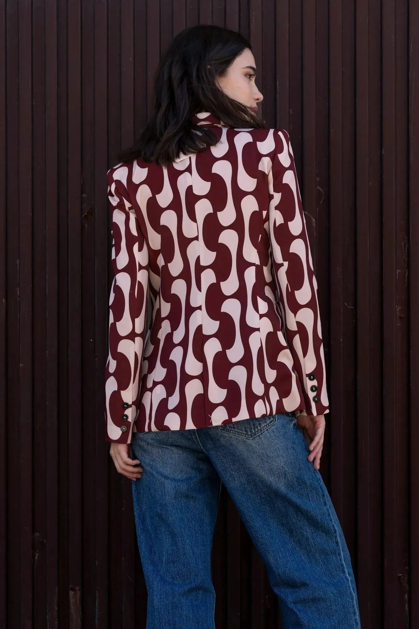 - Portez le blazer motif femme avec un pantalon flare ou une jupe taille haute pour un look élégant.