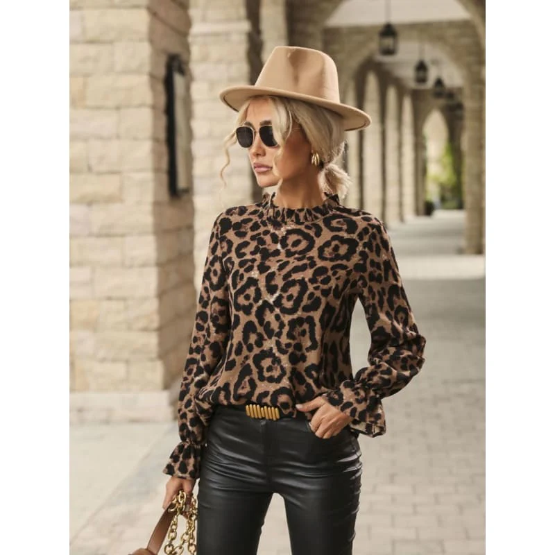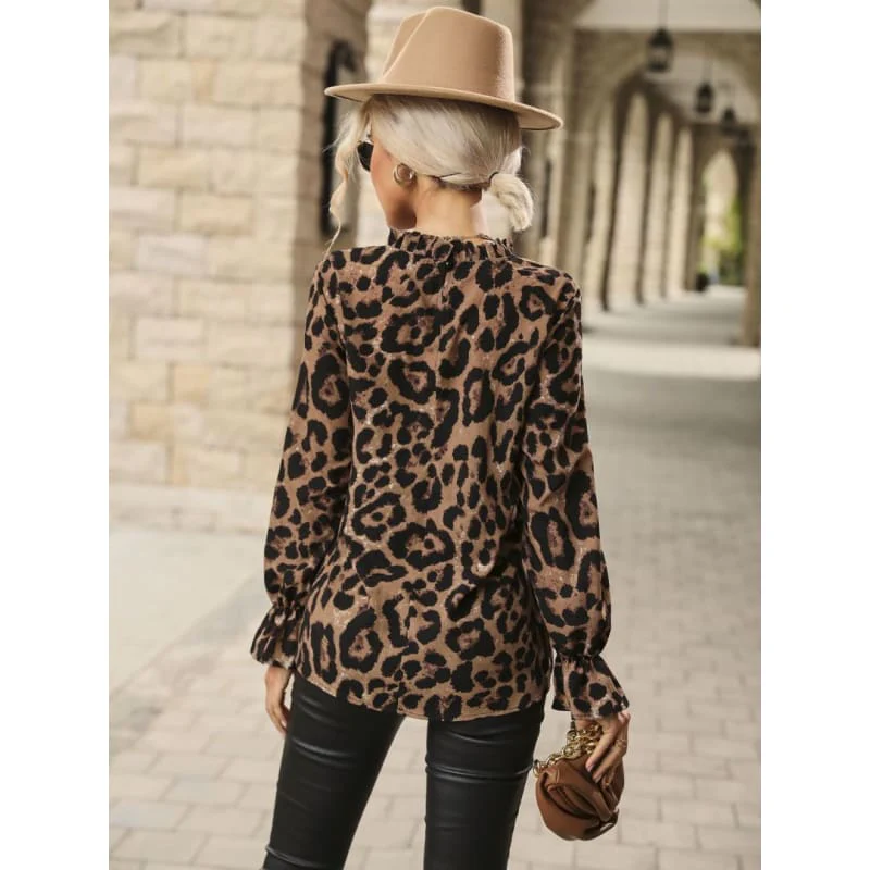 Sympathique petite blouse léopard brun/noir ou pois blanc sur fond vert. Deux coloris au choix. Avec manches terminées par un petit volant. Petit col légèrement remontant et un bouton au dos pour la fermeture. Facile à porter.