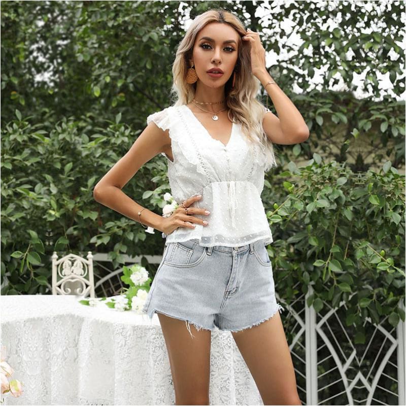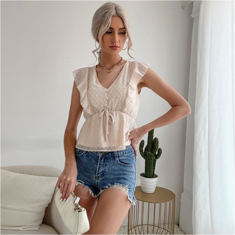 Petite blouse avec tissu légèrement floqué par-dessus. Sans manches, encolure en V et boutonnage sur le devant, ainsi qu’un petit nœud sous la poitrine qui permet de resserrer ce haut et lui donner tout son charme.