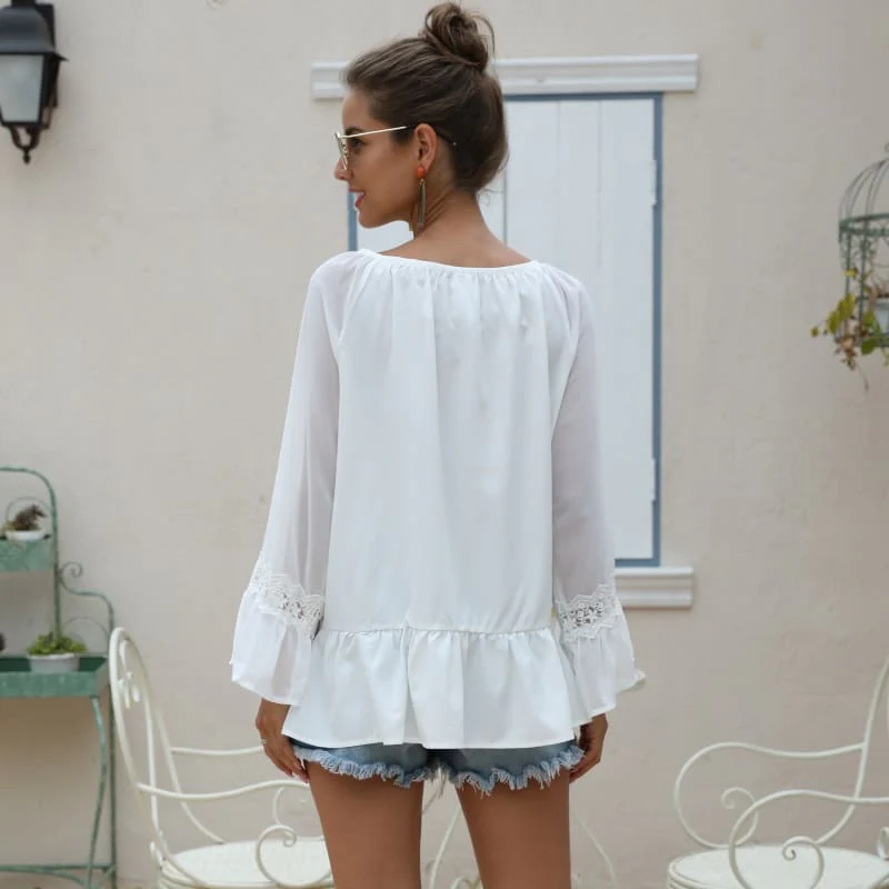 Superbe encolure goutte d’eau terminée par un cordon de serrage pour cette blouse blanche aux décorations de dentelle sur la manche et le bas de la blouse. Un haut qui se porte aisément en toutes circonstances.