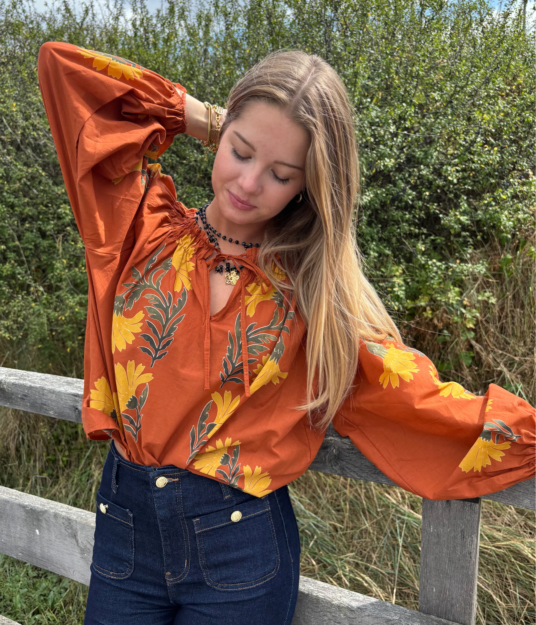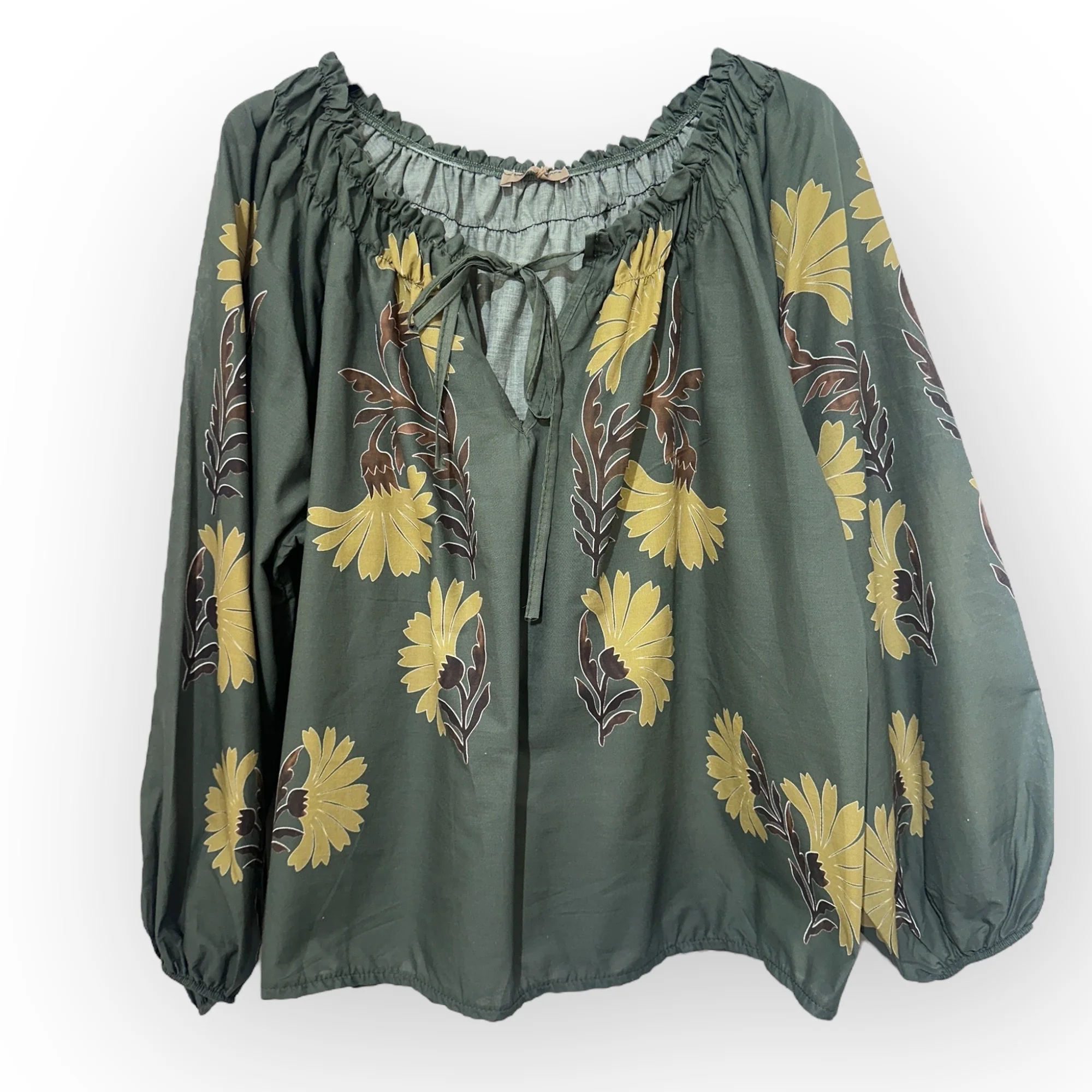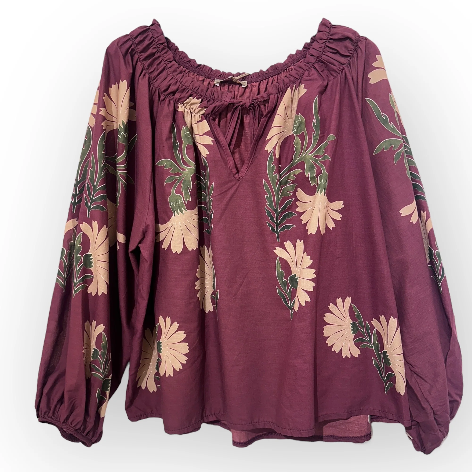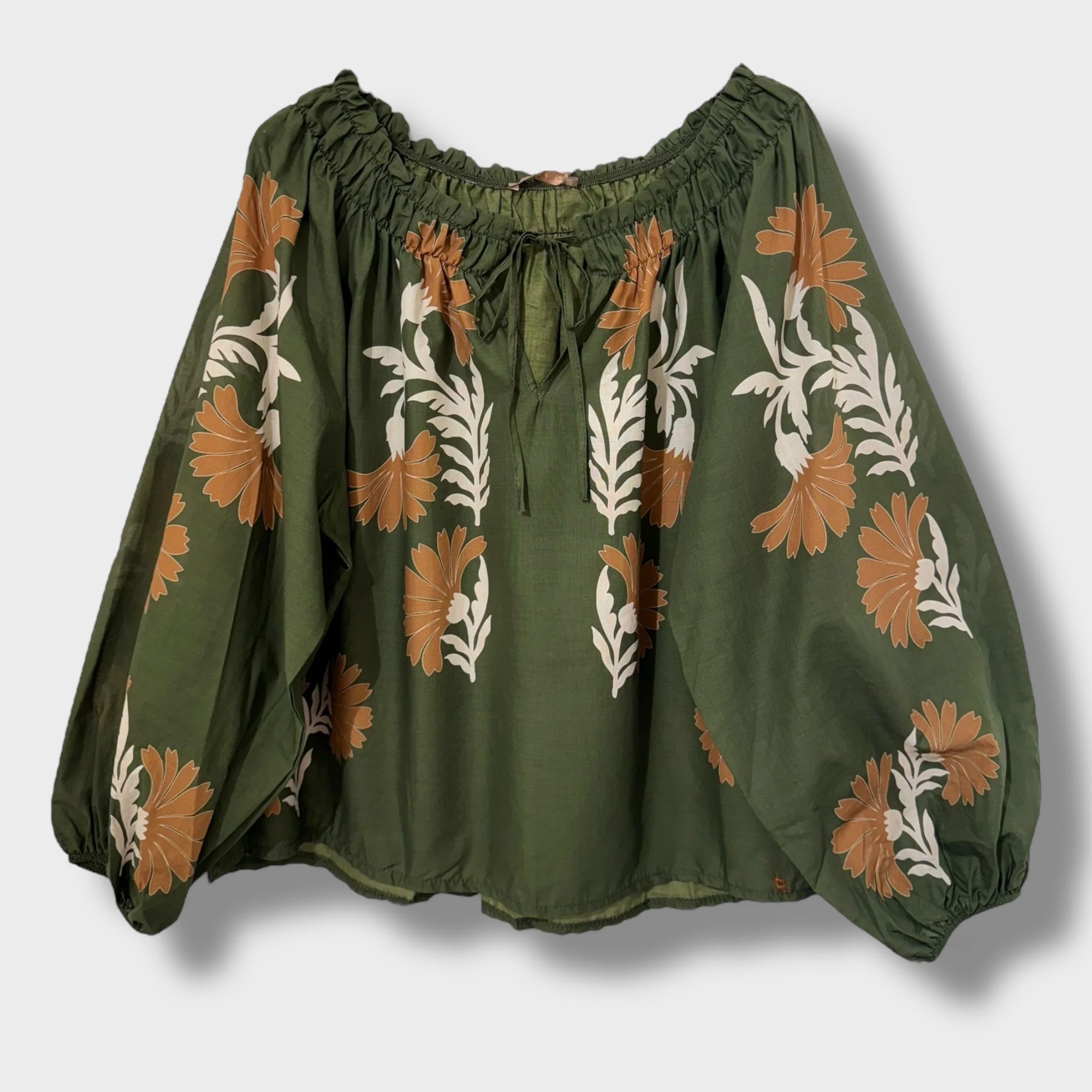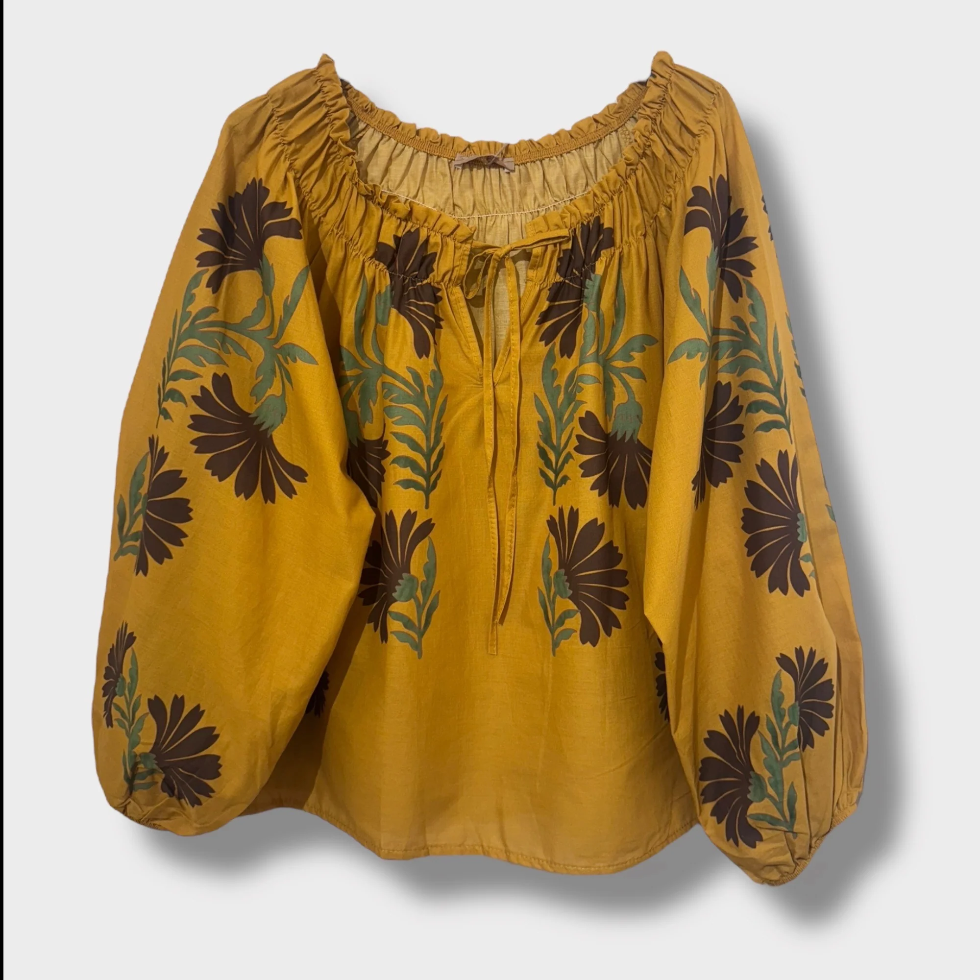 Son col froncé agrémenté d’un lien à nouer apporte un style romantique et féminin, tandis que ses manches longues bouffantes resserrées aux poignets ajoutent une touche bohème élégante. Réalisée en 100 % coton, cette blouse offre légèreté et confort, idéale pour être portée au quotidien comme pour des occasions spéciales.