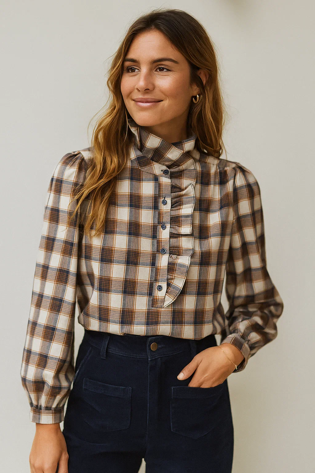 Le détail incontournable de cette blouse : son col montant orné de délicats froufrous, qui apporte une vraie touche chic et romantique. La patte de boutonnage est elle aussi habillée de petits volants, renforçant le charme de cette pièce. Son motif à carreaux allie subtilement des tons bleu marine, caramel et crème, faciles à combiner avec votre dressing.