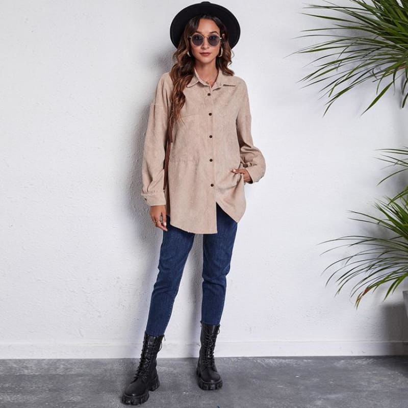 L’ampleur de cette jolie blouse-chemise donne un confort incomparable à ce haut. Deux poches plaquées et un boutonnage sont installés sur le devant, le col est simple et des manches longues complètent bien la tenue. La couleur beige est facile à accommoder.