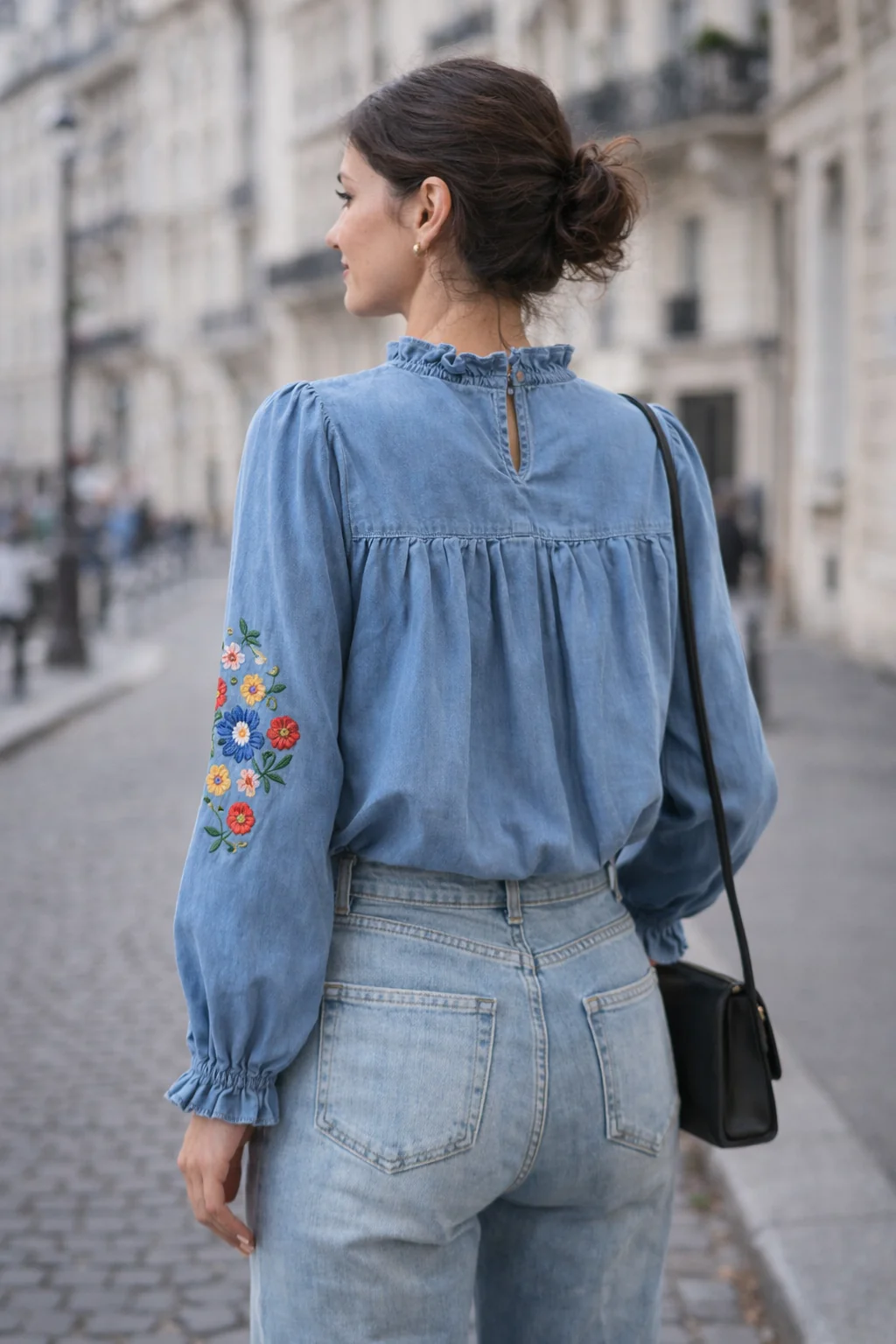 Cette chemise en coton brodée séduit immédiatement par son esprit bohème et ses broderies florales colorées, délicatement placées sur le buste et le long des manches. Son fond bleu doux met parfaitement en valeur les motifs brodés, apportant une touche de fraîcheur et d’originalité à la silhouette. C’est une pièce pleine de caractère, idéale pour sublimer un look du quotidien sans en faire trop.