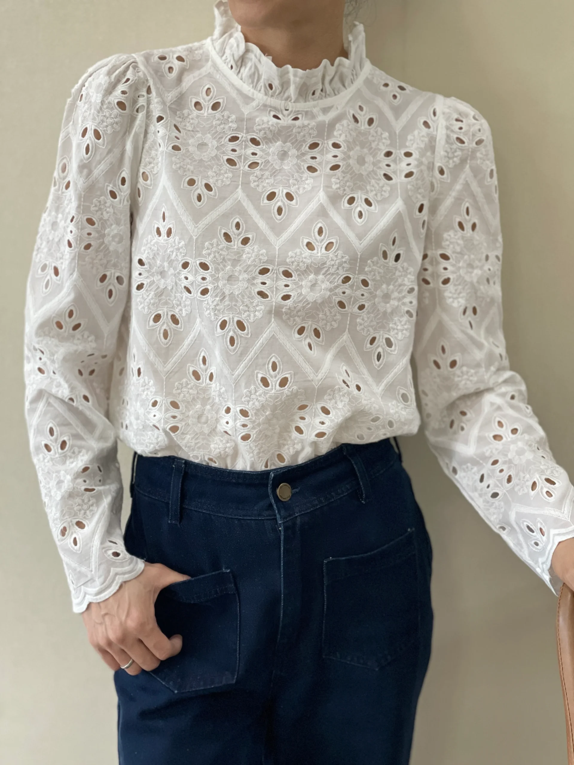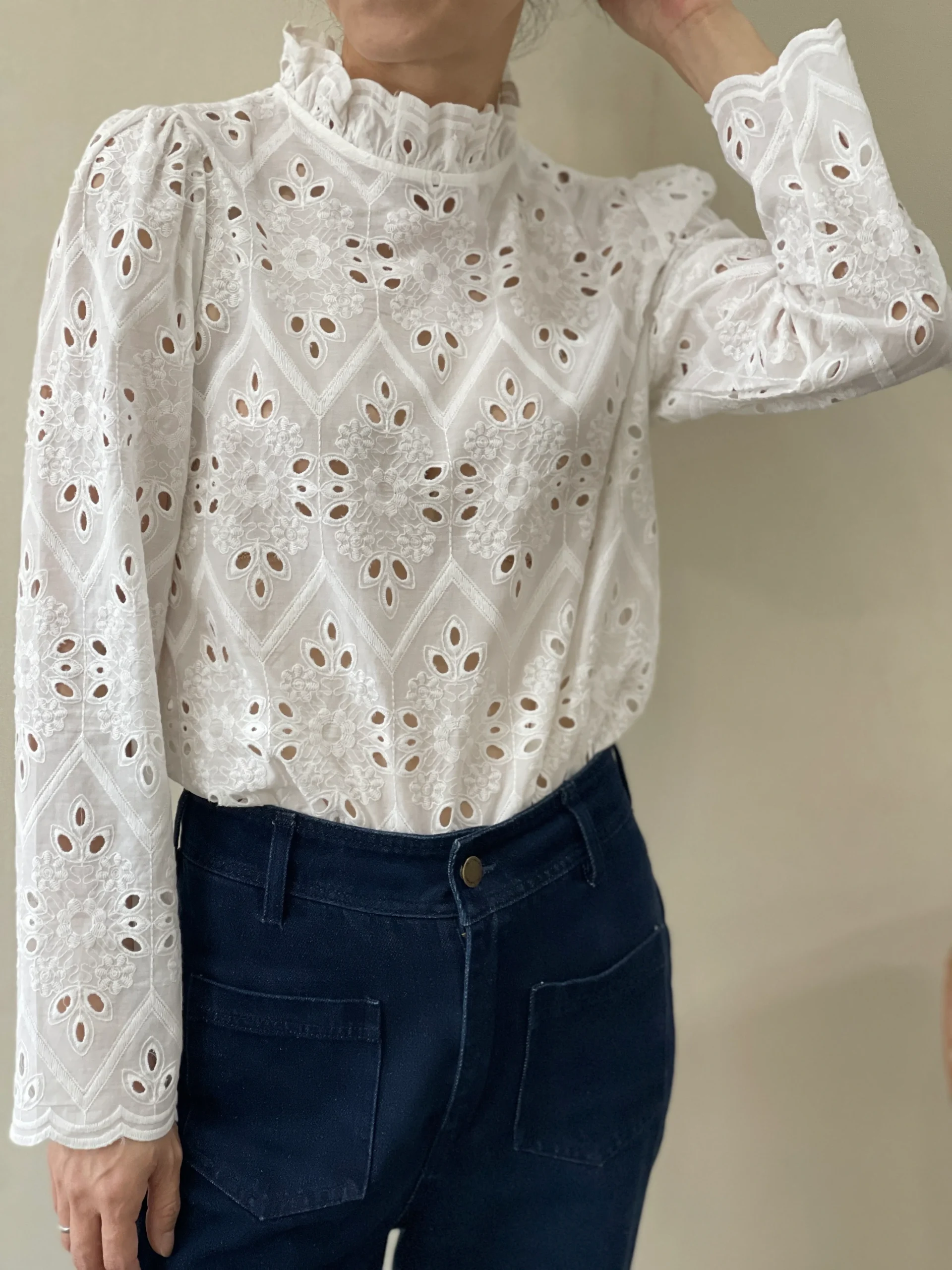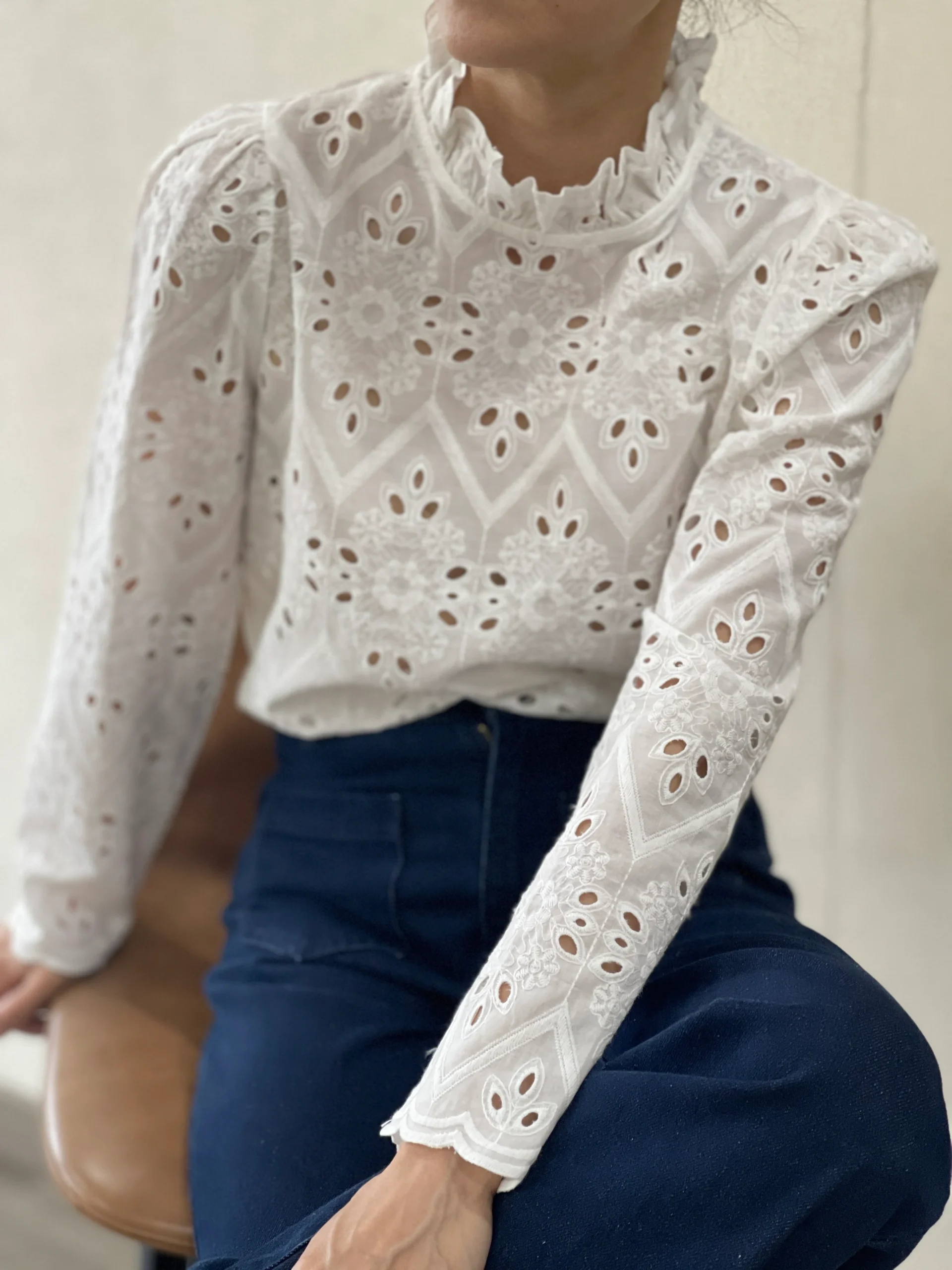 Conçue dans un coton doux et respirant, elle se distingue par ses motifs géométriques ajourés et ses fleurs brodées en relief. Le col montant délicatement volanté et les manches longues bouffantes accentuent son allure féminine et romantique. Sa coupe droite et ses finitions travaillées en font une pièce sophistiquée, idéale pour habiller vos tenues du quotidien comme vos soirées.