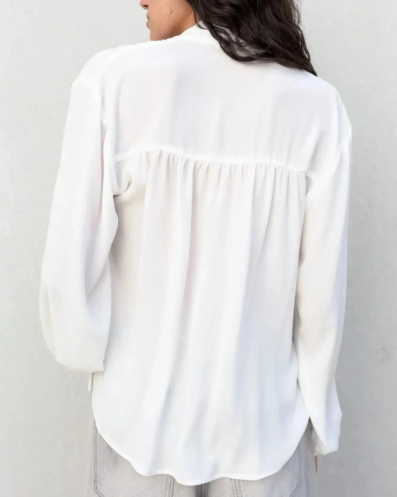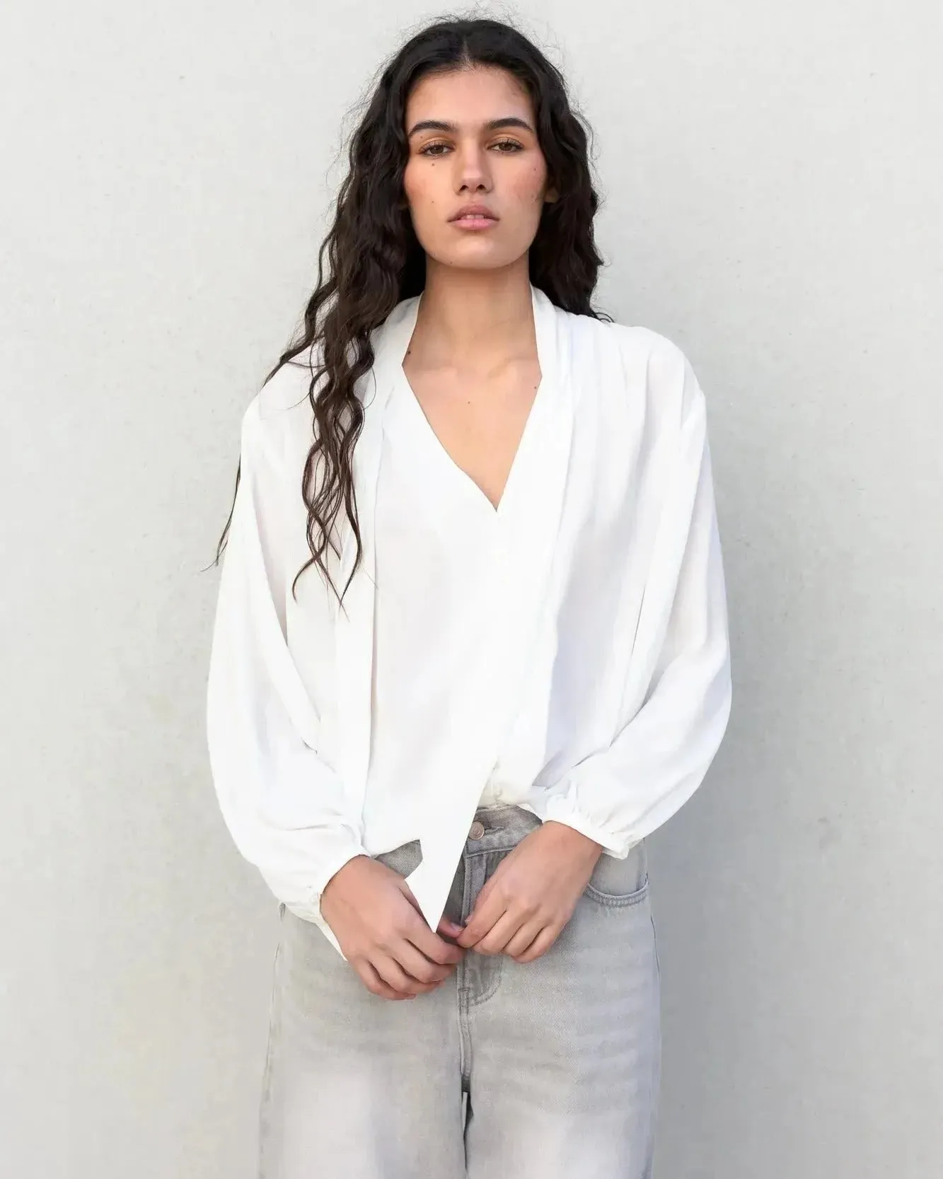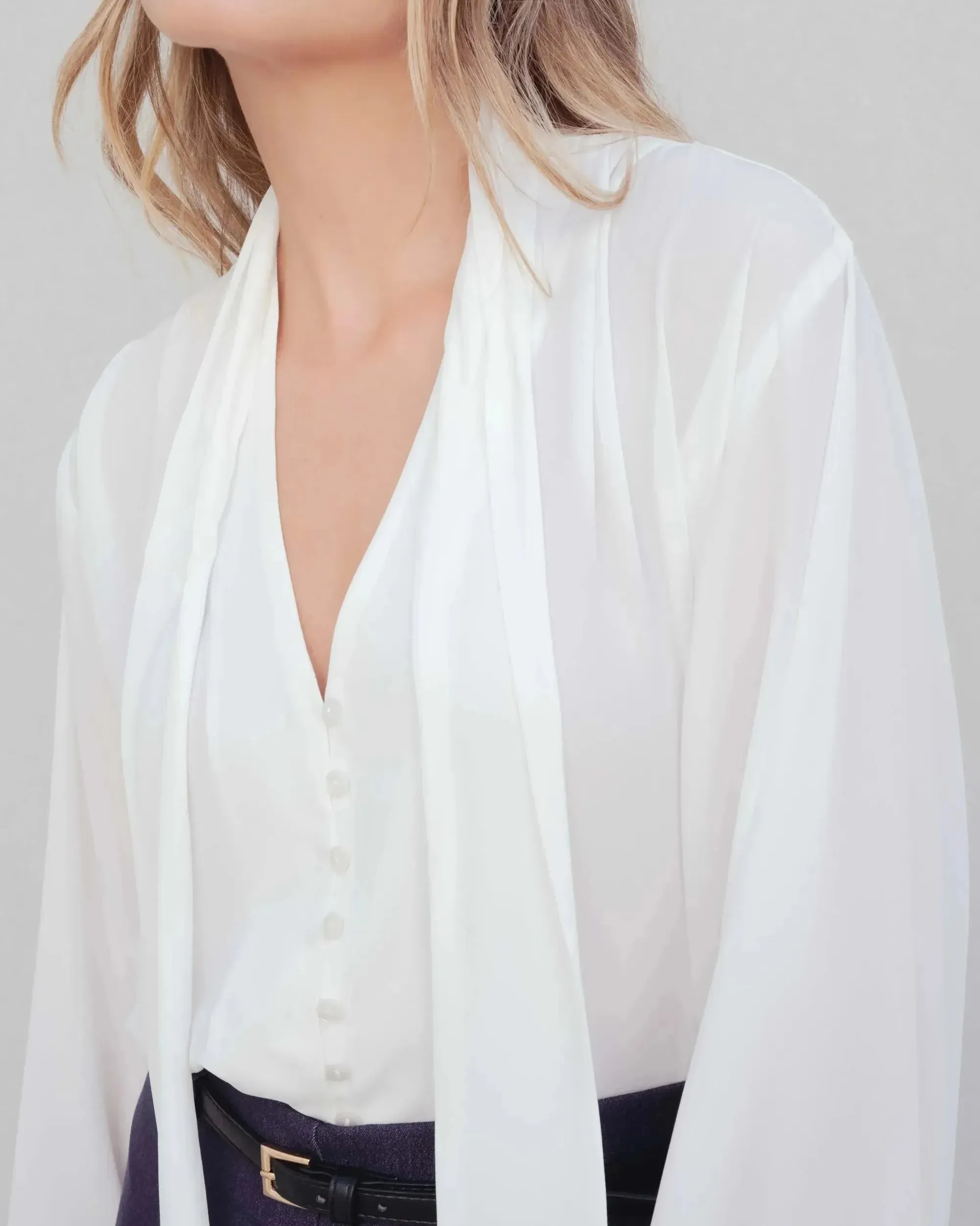 Blouse Fluide Élégante Blanche À Nouer – Design Minimaliste, Col Plongeant, 100% Polyester