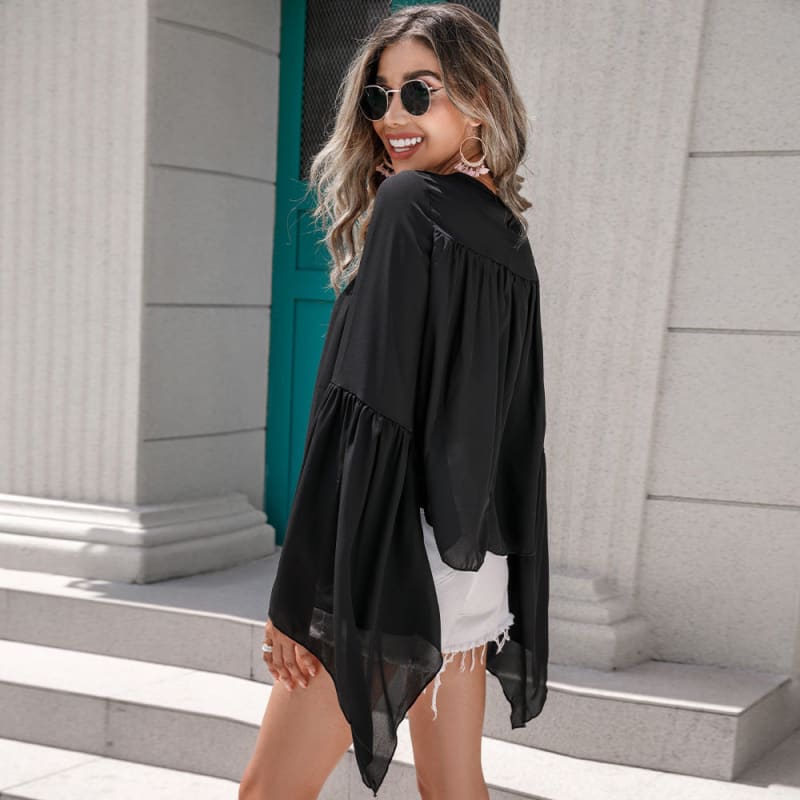 Petit haut, noir. Avec manches longues, amples et asymétriques. Corps de blouse ample et encolure arrondie. Très agréable à porter en toutes occasions ! Type d’article : blouse Épaisseur : fine Matériel : polyester Longueur : courte Coupé : ample Style : chic Somptueuse cette blouse femme chic tendance. Encore plus de produits dans les […]
