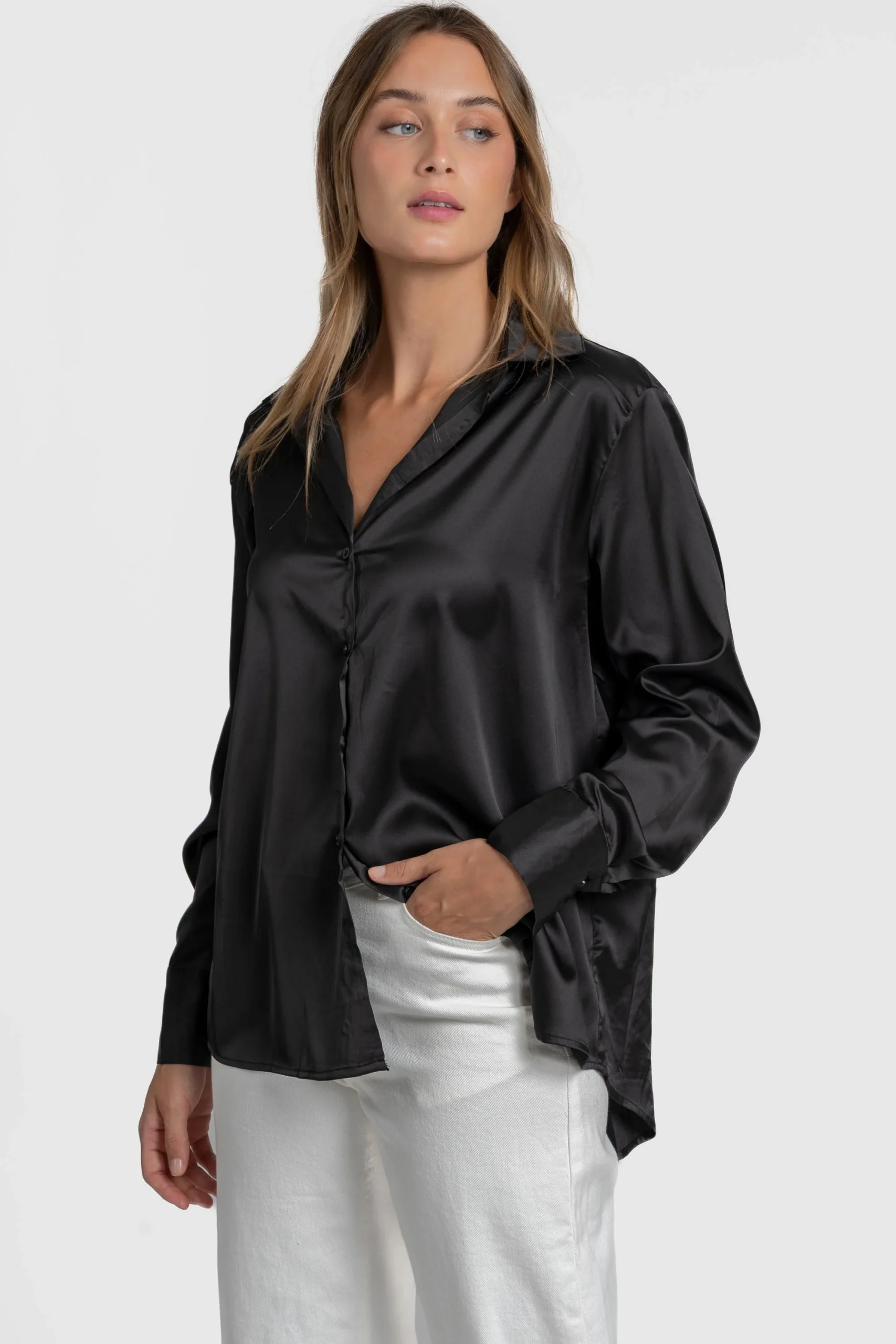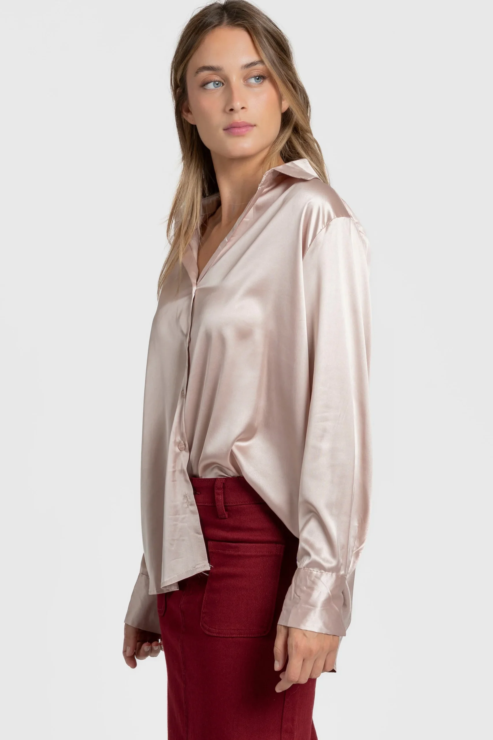 La finition satinée reflète subtilement la lumière sans brillance excessive, rendant cette blouse satinée manches longues idéale aussi bien avec un pantalon tailleur qu’avec un jean ou une jupe structurée.