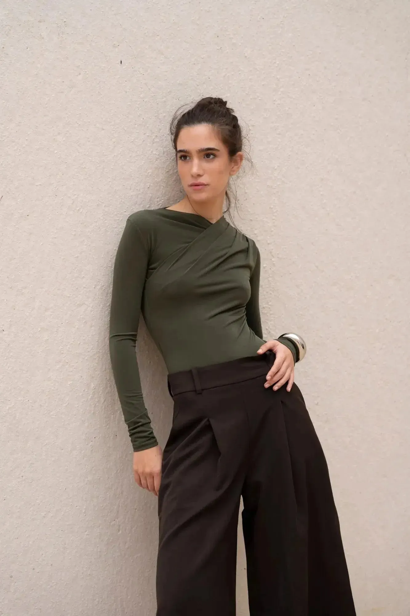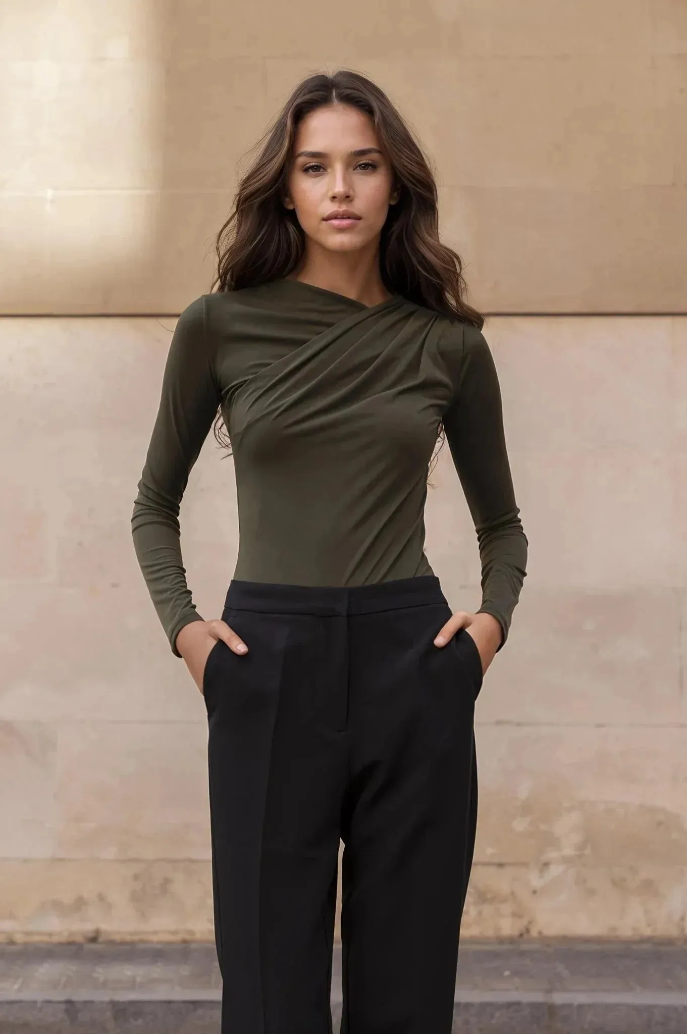 Body Vert Olive Asymétrique Avec Drapé Élégant, Manches Longues – Sapiato