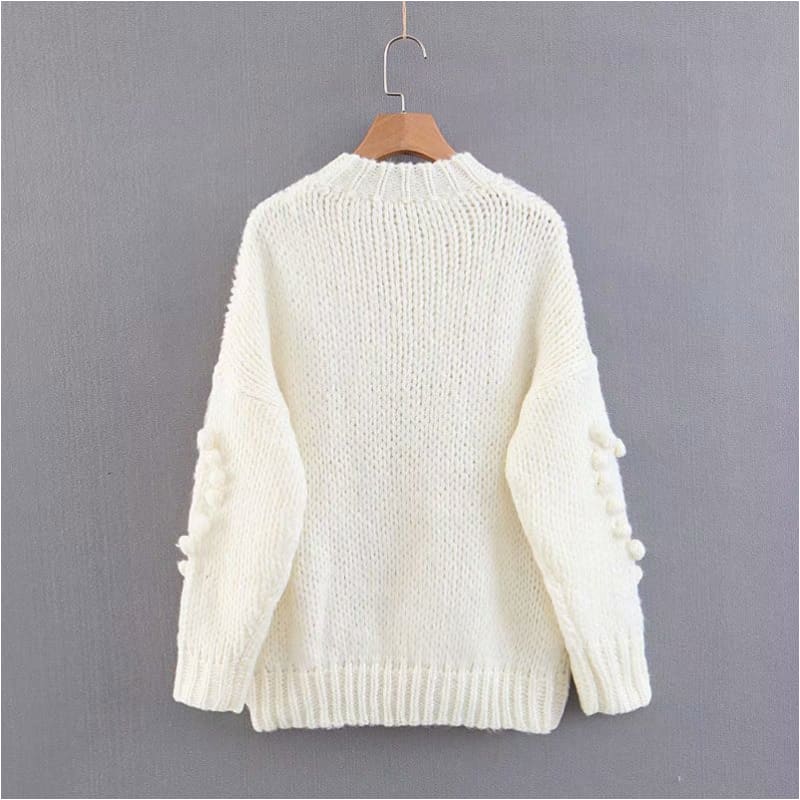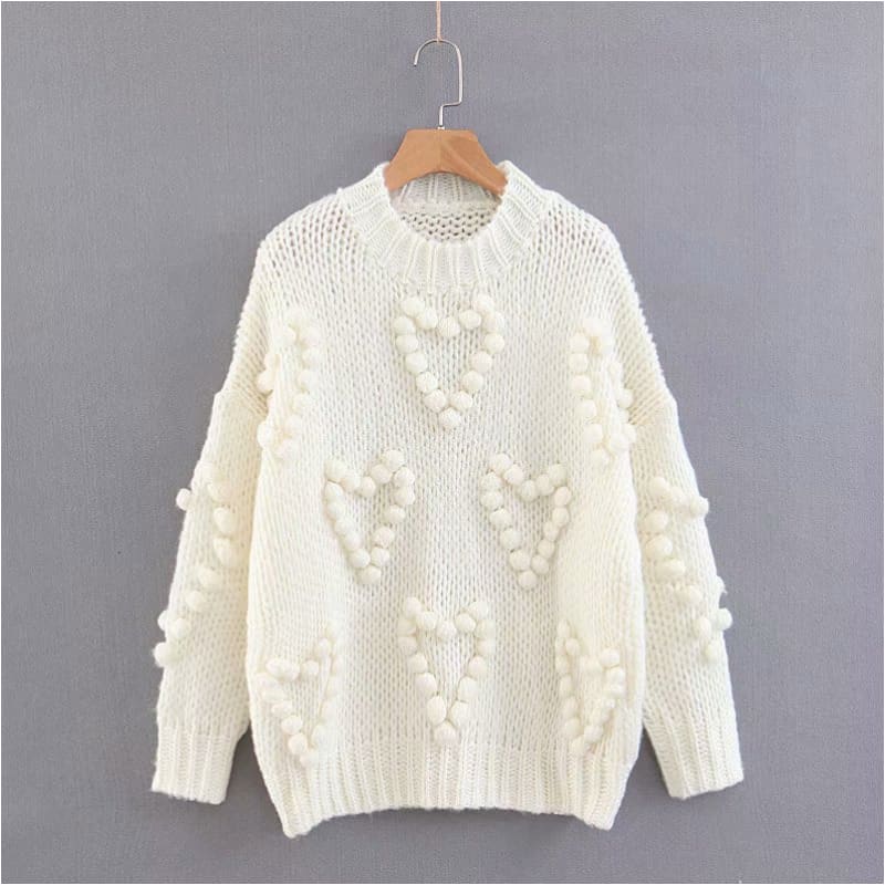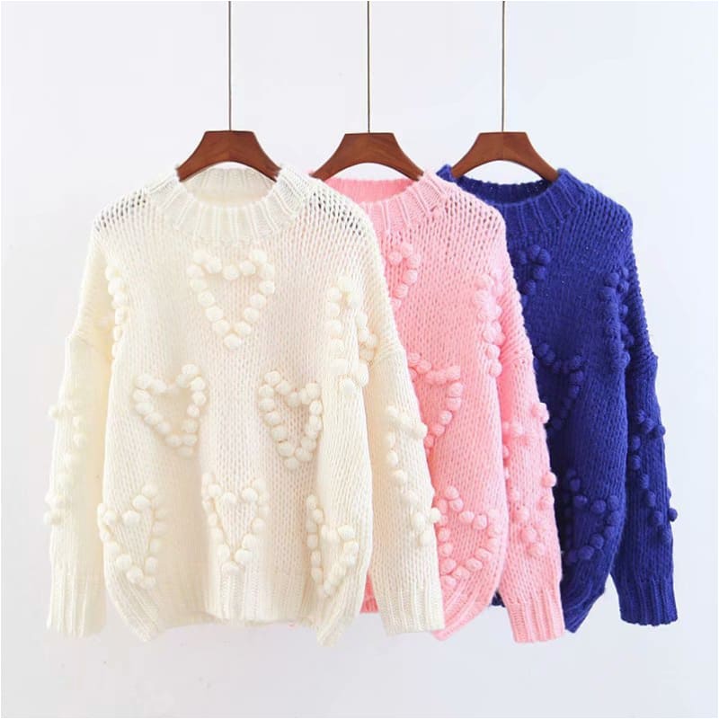 Pull en différentes couleurs, unis. À longues manches. Avec un joli relief de cœur en pompons à l’avant et sur les manches, encolure ronde. Élégance et douceur bohème.