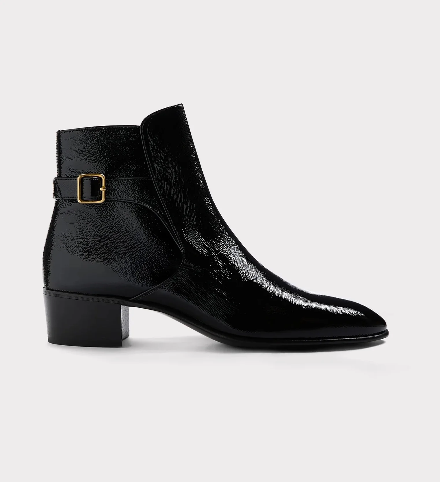 Bottines à boucle en cuir de veau verni craquelé italien.