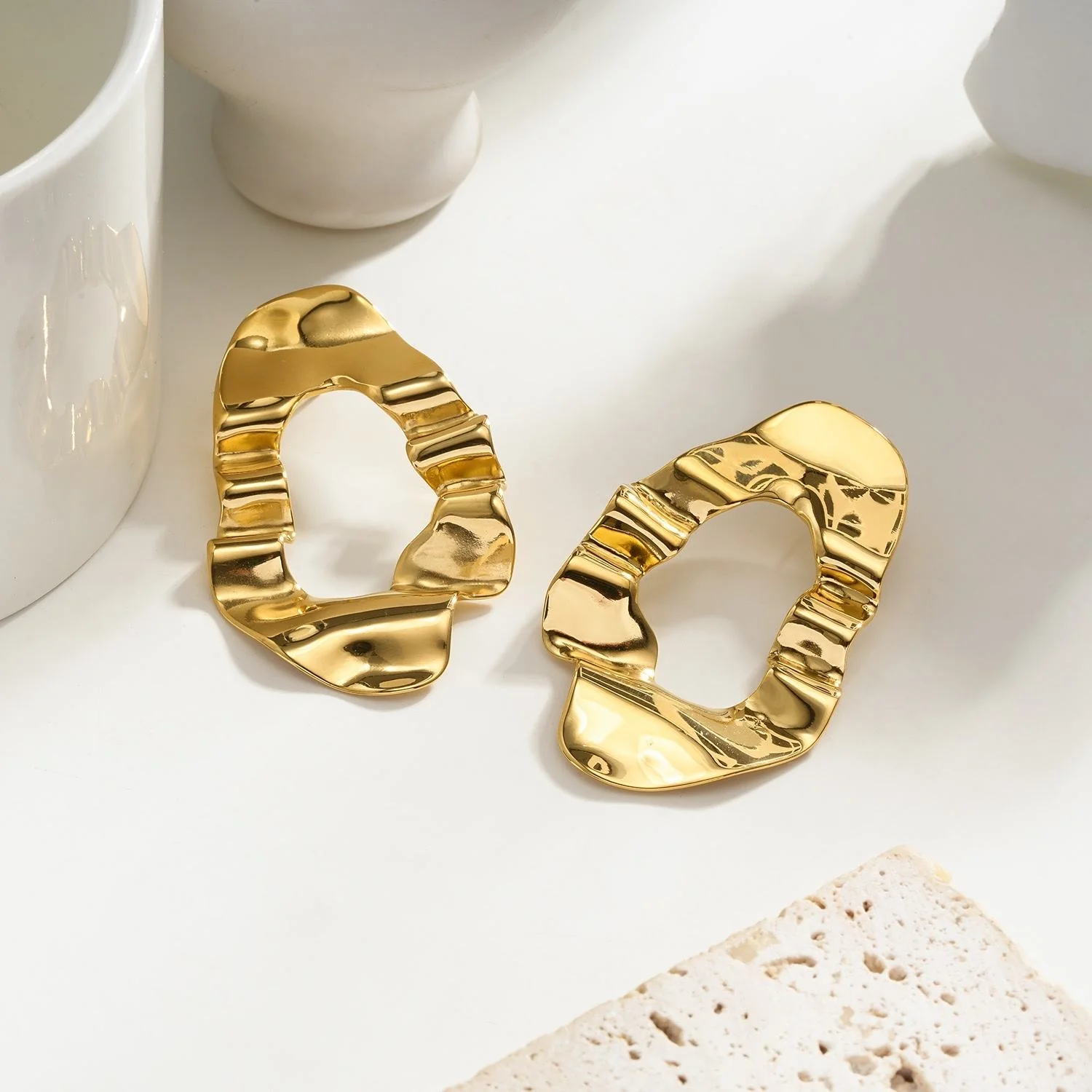 Ces boucles se distinguent par leur forme irrégulière et organique, rappelant des sculptures contemporaines. La finition dorée brillante reflète la lumière et ajoute une touche sophistiquée à n’importe quelle tenue. Elles sont idéales pour celles qui aiment les bijoux audacieux et uniques.