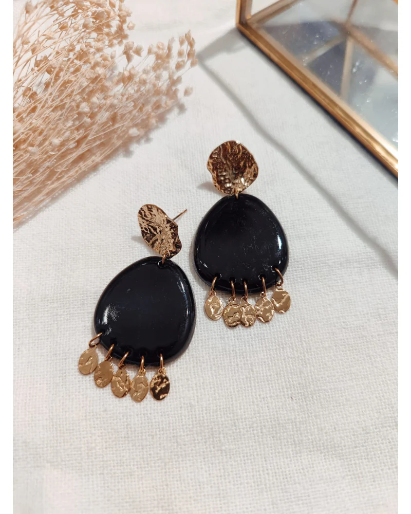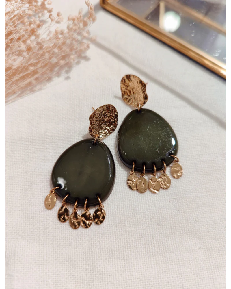 Élégantes et raffinées, ces boucles d’oreilles ovales dorées se distinguent par leur cabochon coloré (cognac, kaki ou noir) et leurs pampilles martelées qui captent joliment la lumière. Elles allient modernité et esprit bohème chic pour sublimer vos tenues au quotidien comme en soirée.