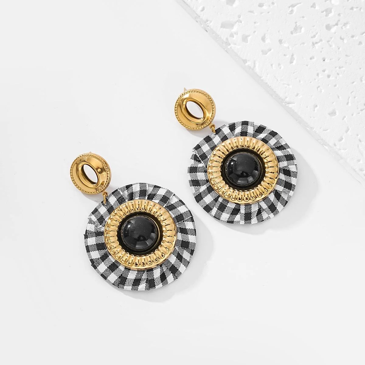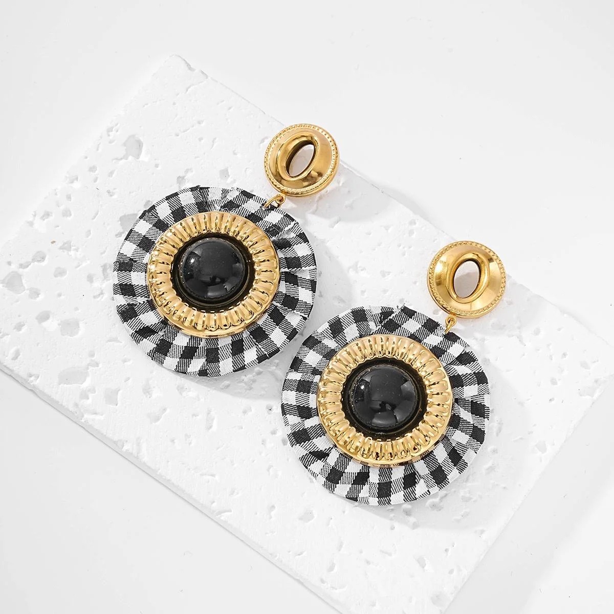 Chères clientes, ces boucles d’oreilles fantaisie sont une véritable pépite pour apporter une touche mode, originale et élégante à vos tenues. Leur design combine une pastille dorée à l’aspect martelé et un large médaillon rond habillé de tissu vichy noir et blanc, souligné par un cabochon noir brillant et un cerclage doré texturé.