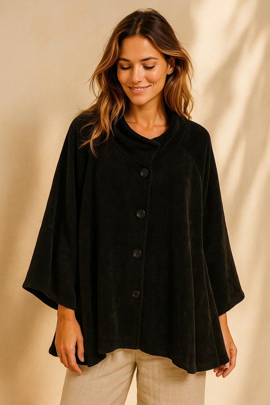 Cette cape en velours incarne l’esprit cocooning et raffiné du style Hippie Chic. Confectionnée dans une matière douce et fluide composée de 95 % polyester et 5 % élasthanne, elle offre un toucher velouté et une aisance incomparable. Sa coupe ample et fluide permet de la porter facilement sur un pull, une chemise ou un col roulé, tout en garantissant un tombé élégant.