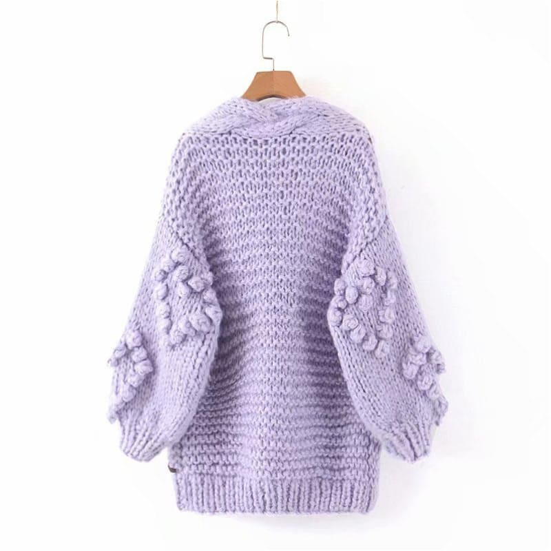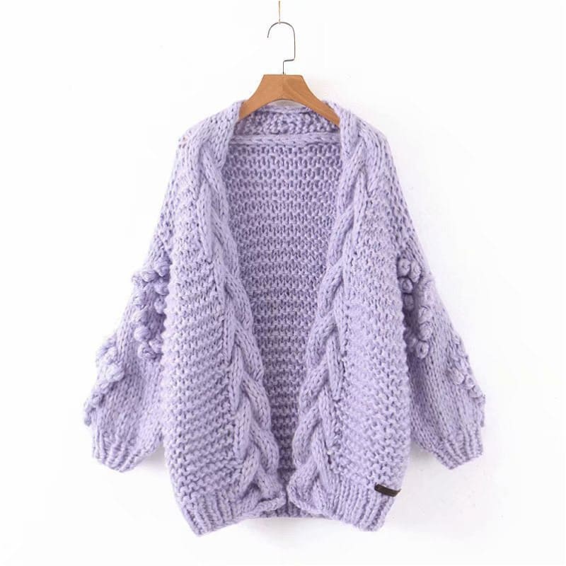 Cardigan en lainage épais à manches longues. Torsades larges en bordure d’encolure. Réalisé en deux coloris au choix : violet ou vert. Les soirées bien au chaud dans votre cardigan.
