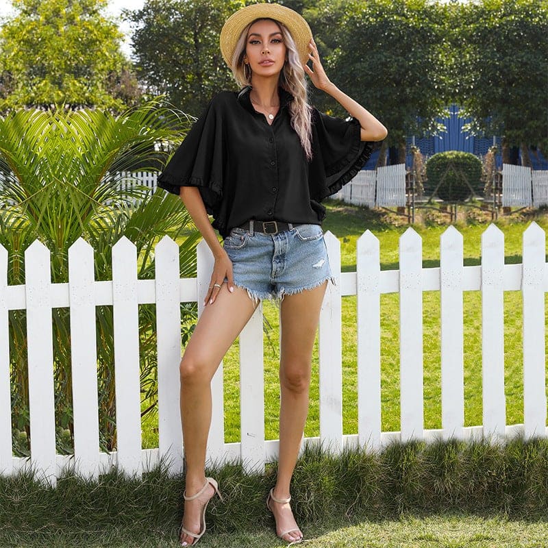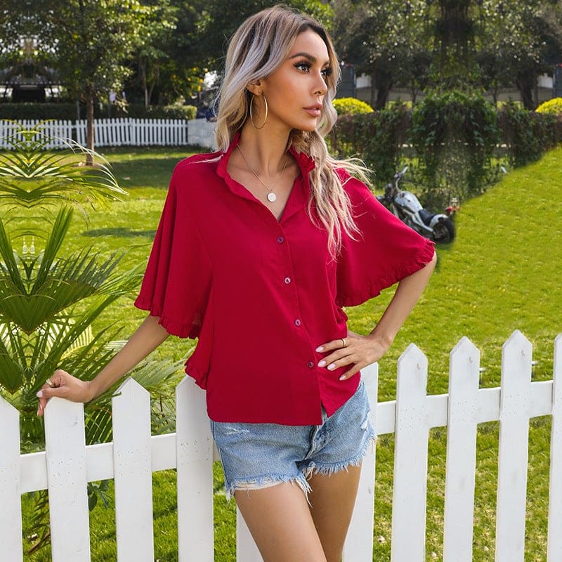 Chemise à manches courtes, en rouge ou en noir, à emmanchures larges bordées d’un petit volant. Boutonnée sur le devant et petit col montant rehaussé d’un petit volant. Pour accompagner vos pantalons et shorts en toutes occasions !