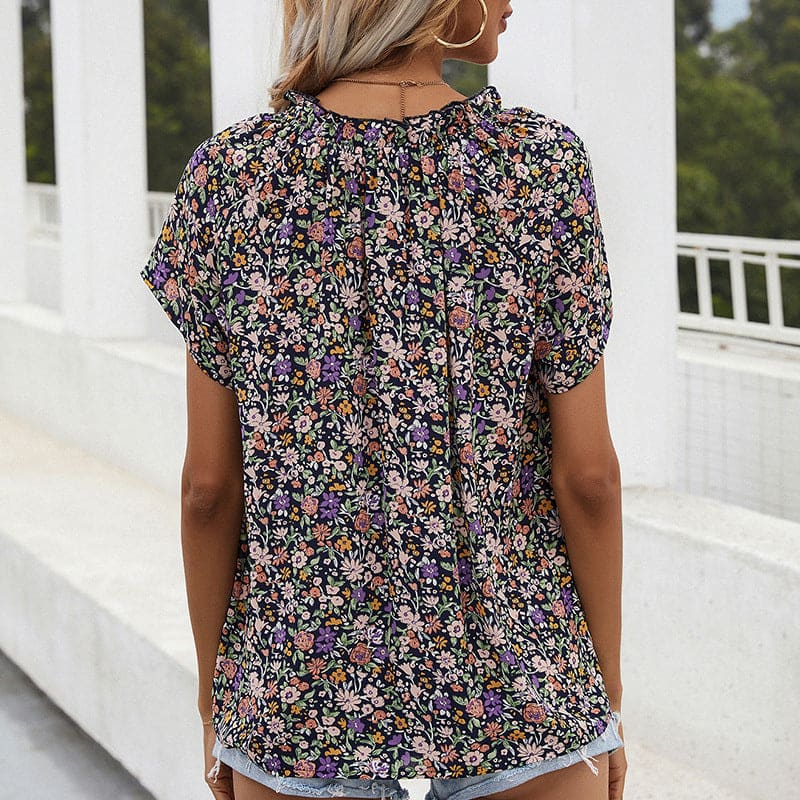 Chemise à petites fleurs dans les coloris beige ou noir. Avec manches courtes et petite encolure en V bordée d’un liseret blanc. Boutonnage à l’avant. Facile à coordonner et à porter.