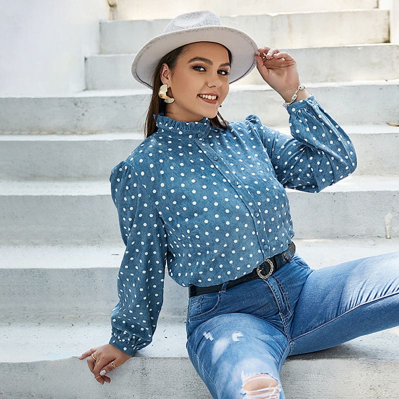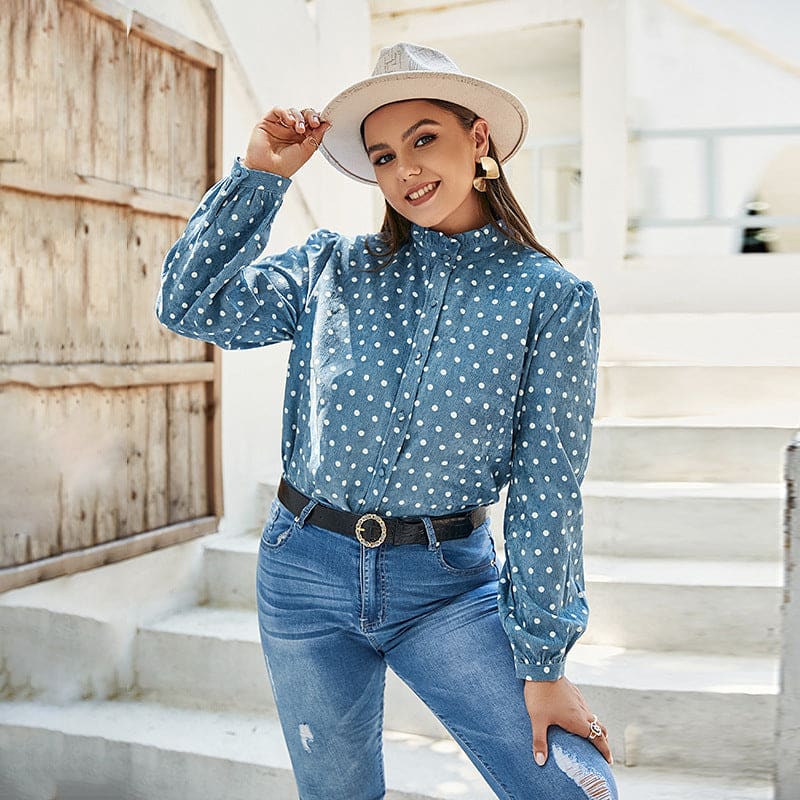 Hyper tendance cette chemise bleu avec des pois blanc. Manches longues et boutonnée sur le devant, cette chemise récolte un beau succès avec son petit col montant à volant.