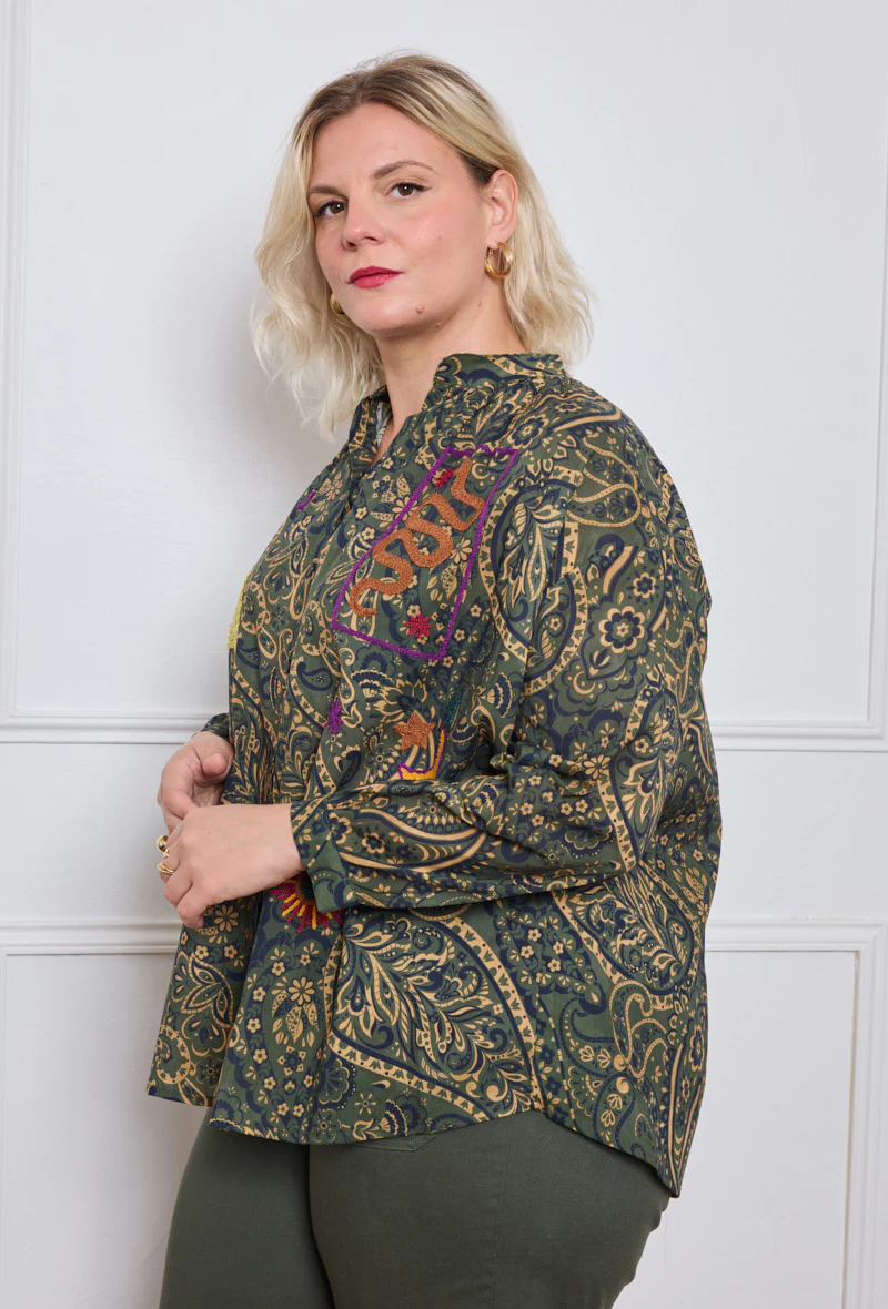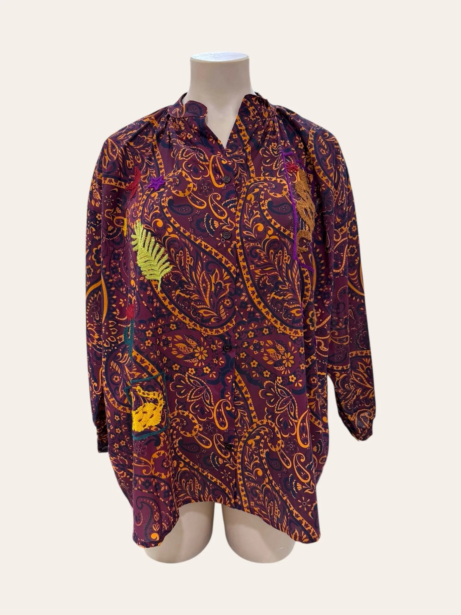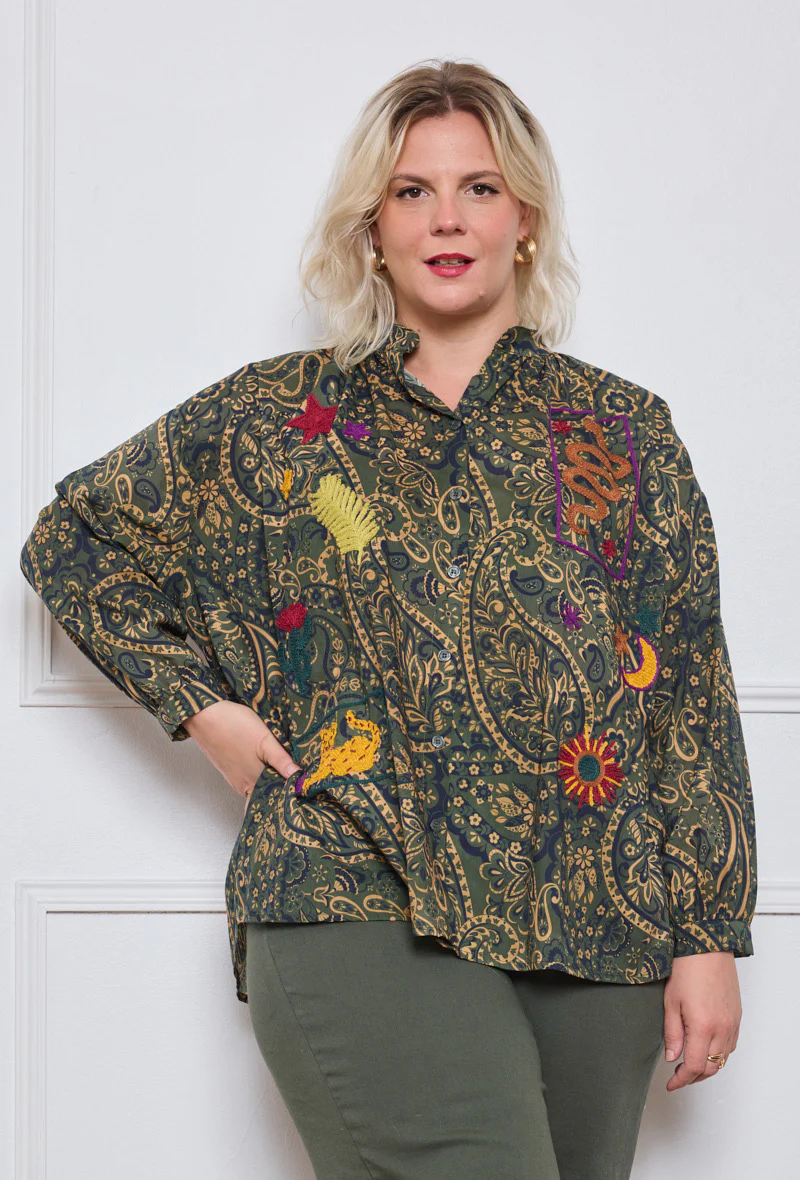 Les manches longues et le col classique apportent une touche d’élégance, tandis que les broderies et imprimés donnent à cette chemise un caractère unique, parfait pour un look bohème chic ou casual.