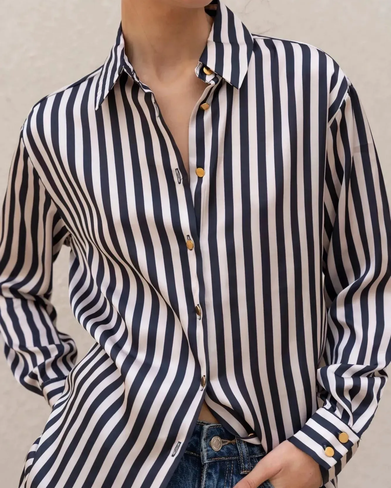 Chemise Rayée Femme Bleu Marine et Blanc, Manches Longues, Détails Dorés Élégants