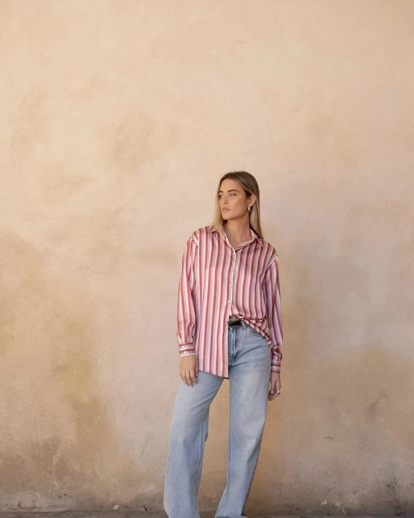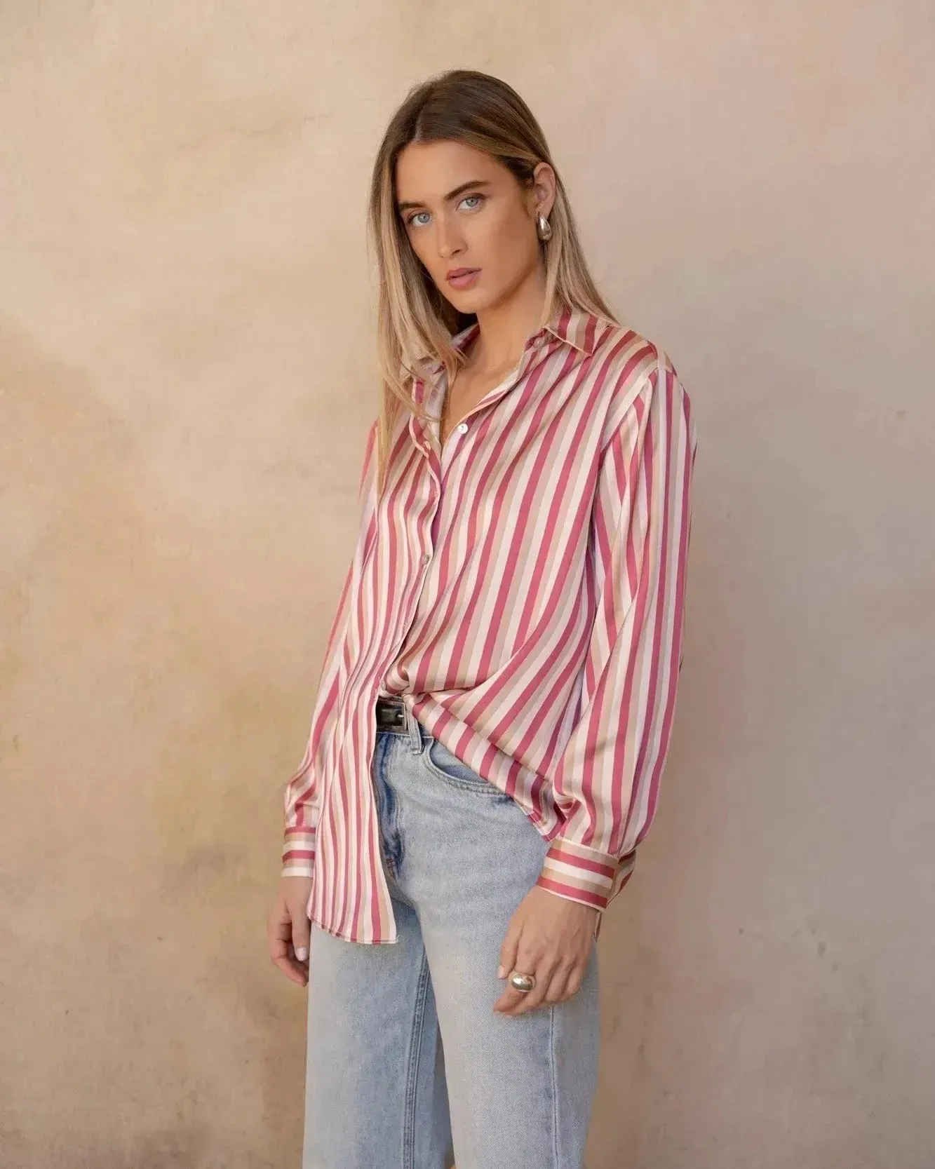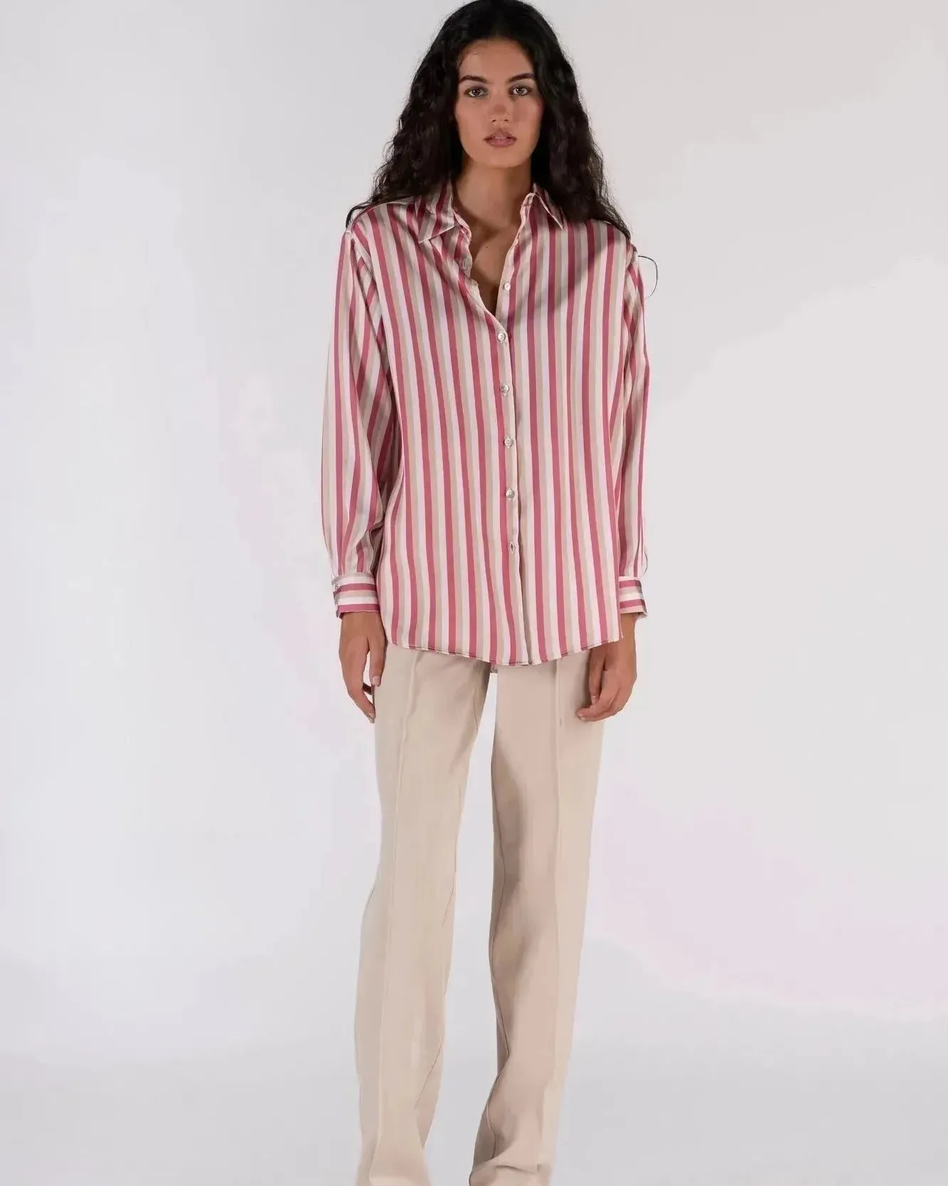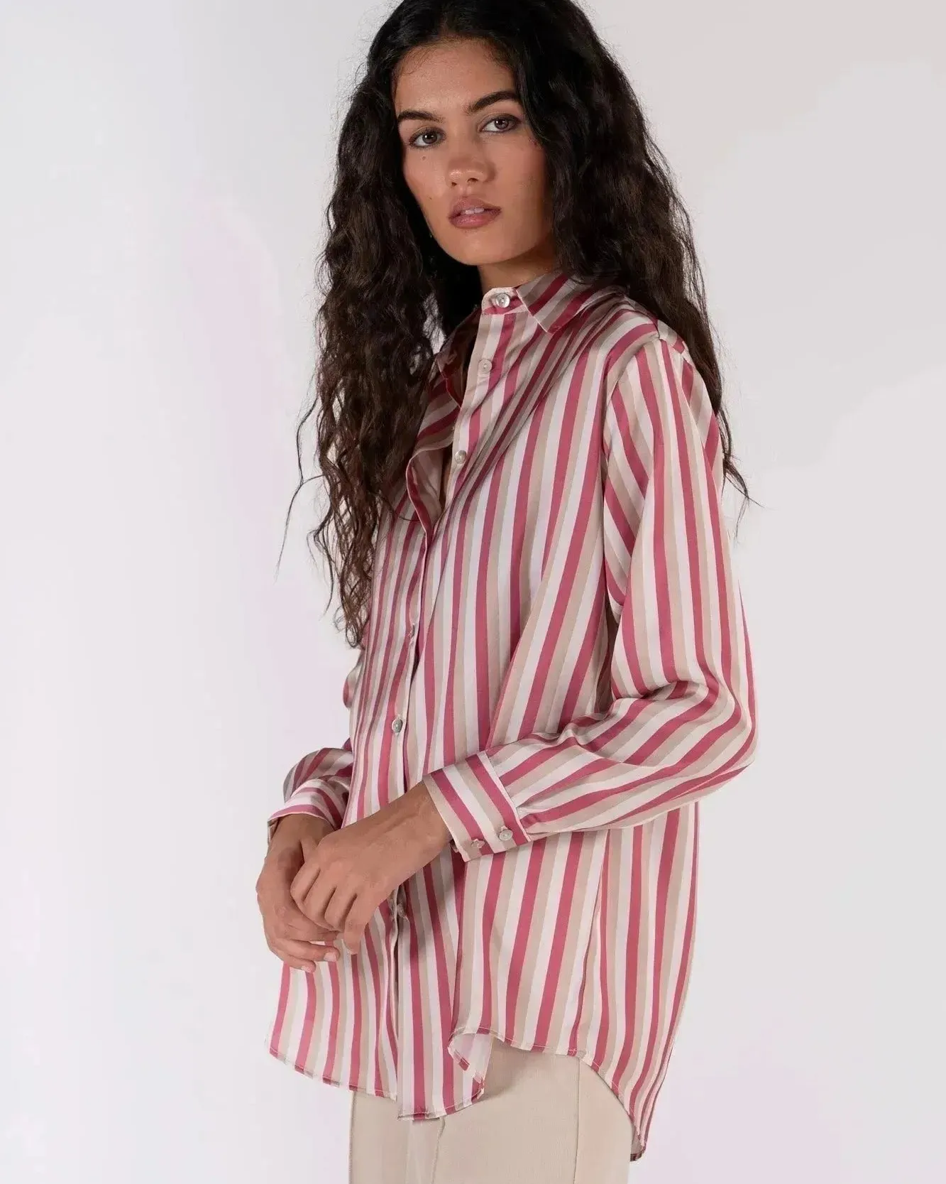 Chemise satinée à rayures écru et rose
