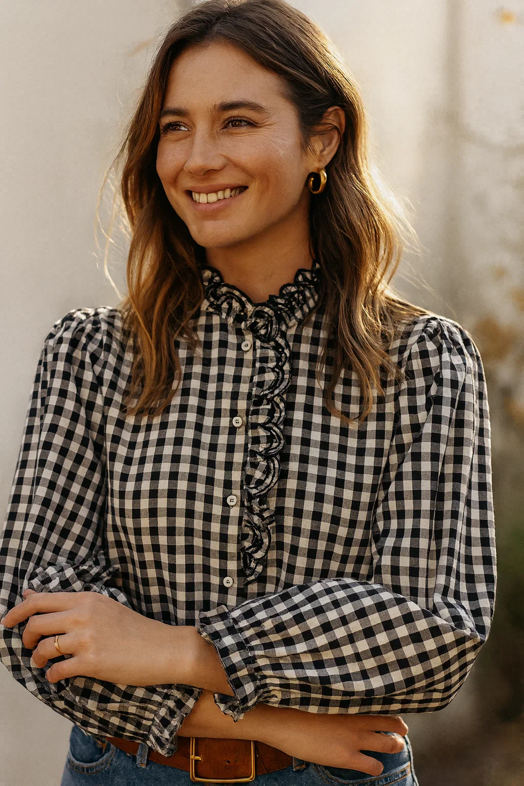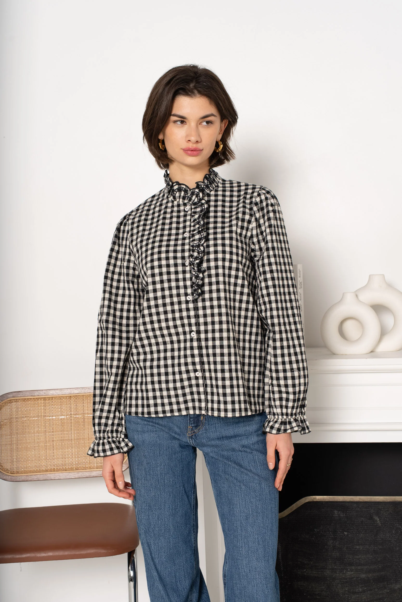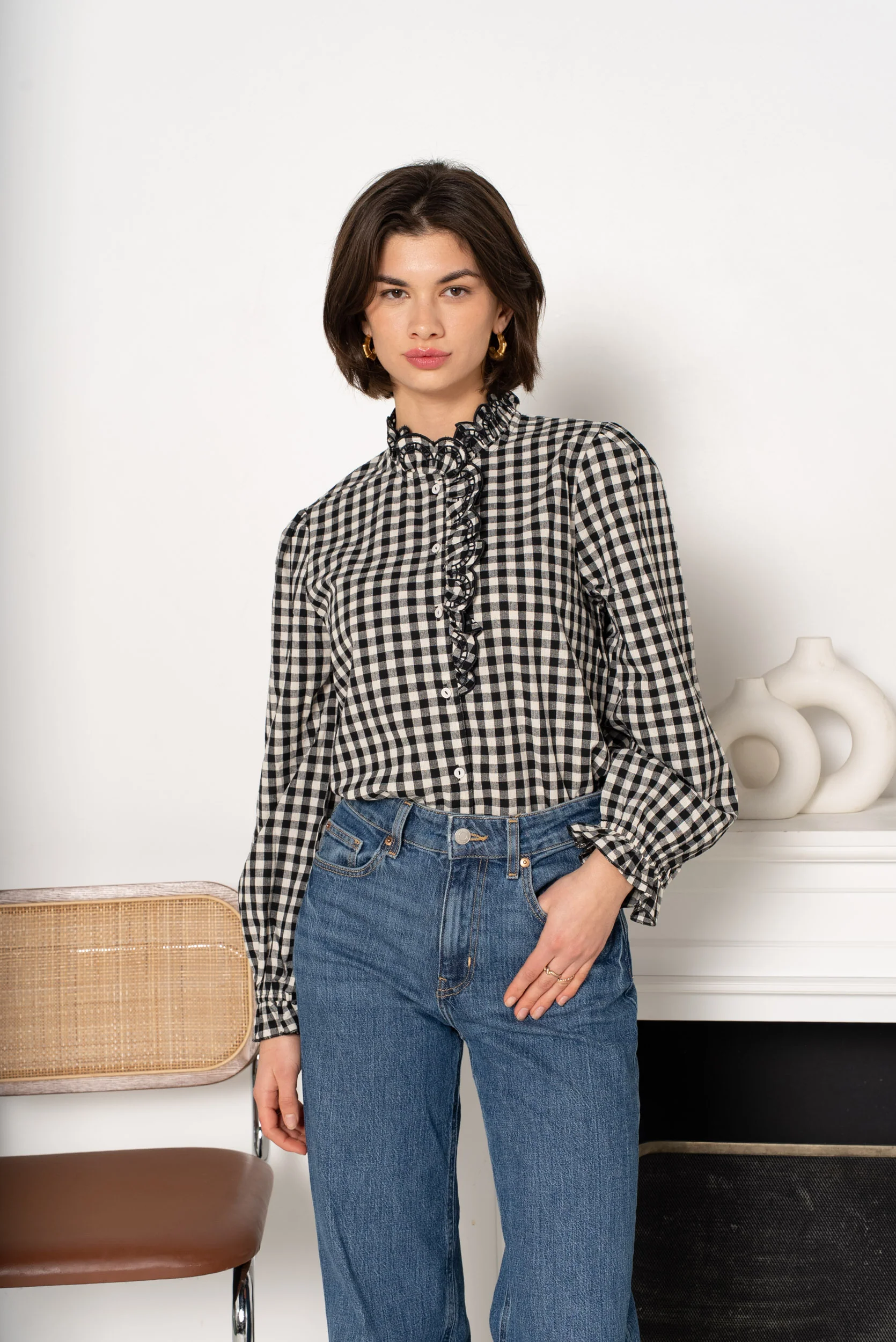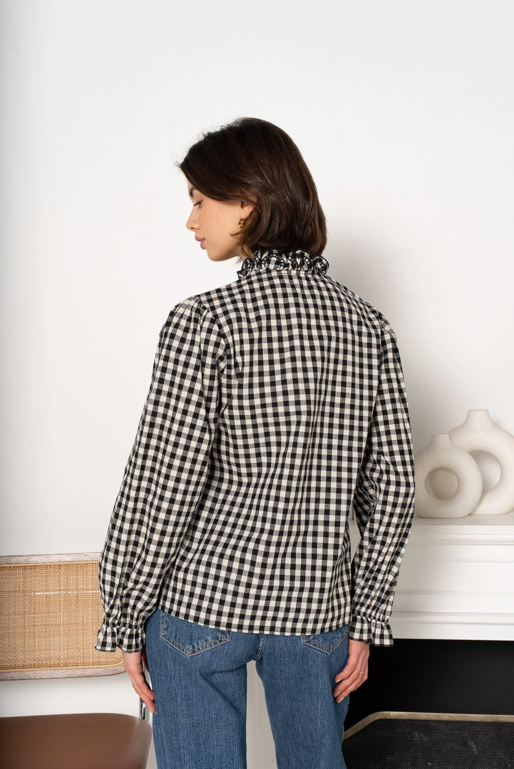 Le col montant délicatement volanté sublime le port de tête et apporte une touche très féminine. Une rangée de volants le long de la patte de boutonnage donne du caractère à la chemise sans la surcharger. Les poignets froncés, eux aussi légèrement volantés, renforcent cette allure raffinée.