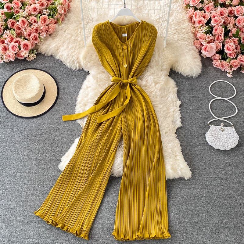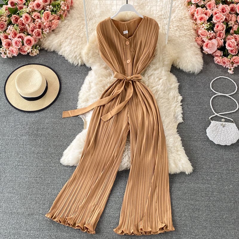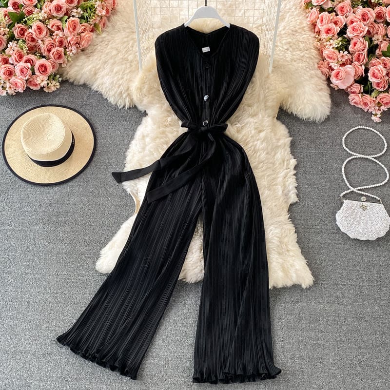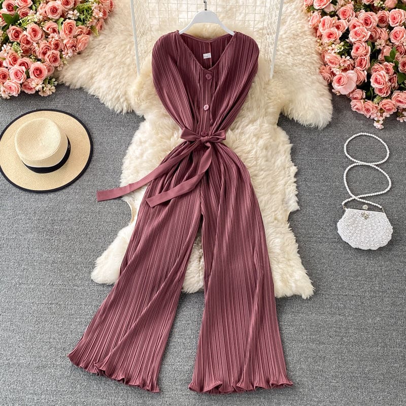 Combinaison souple déclinée en cinq coloris. Une très belle encolure en V, un boutonnage à l’avant. Pas de manches pour cette tenue. Une taille élastiquée et bas de pantalon large. Une sensualité sans pareil.
