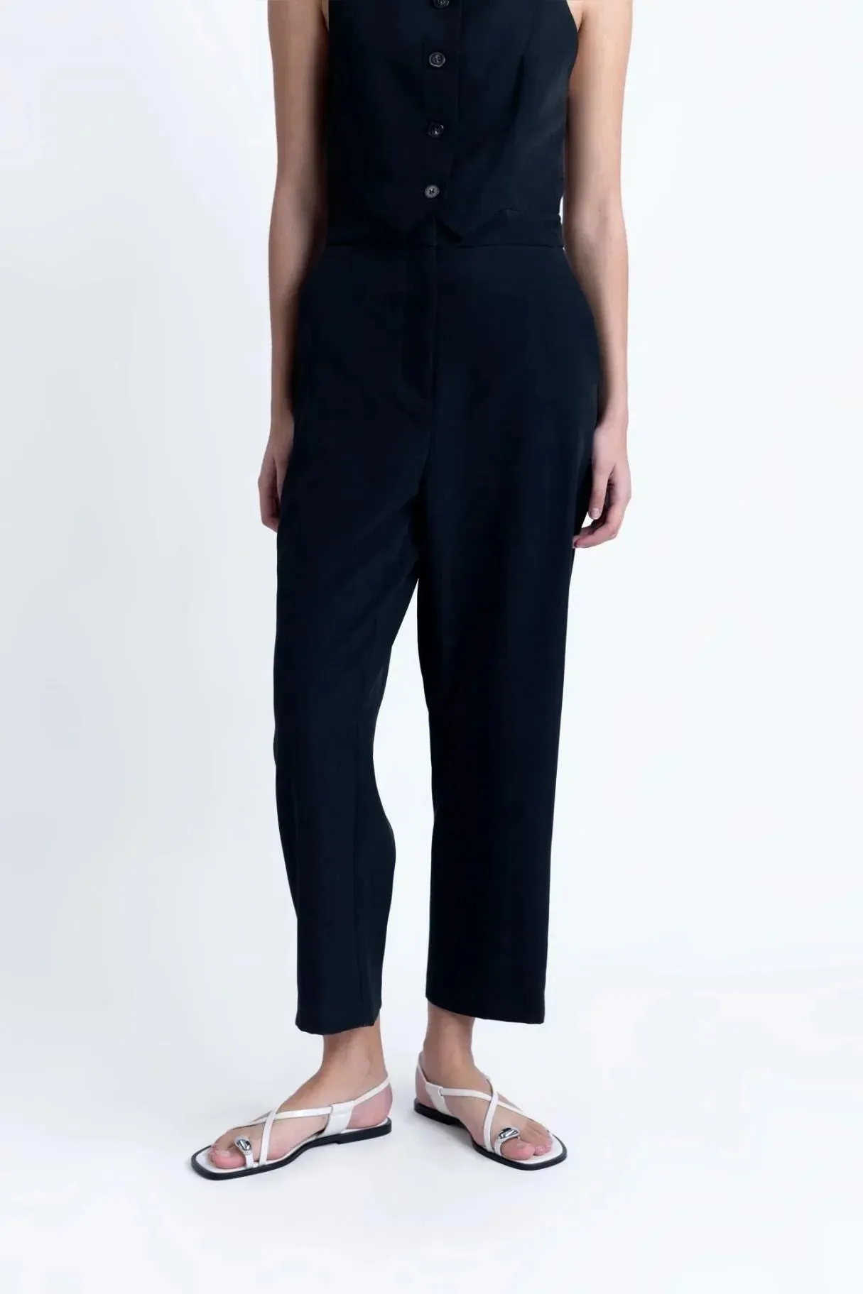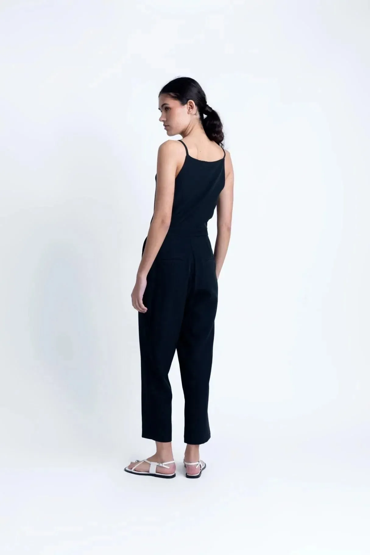 Cette combinaison noire femme se distingue par sa polyvalence et son élégance intemporelle. Sa matière fluide épouse délicatement votre silhouette, offrant un tombé naturel et un look chic sans effort. Avec une taille haute mise en avant et un dos dégagé, vous êtes assurée de faire tourner les têtes. Que vous la portiez au quotidien ou lors d’une sortie habillée, elle s’impose comme un choix incontournable.