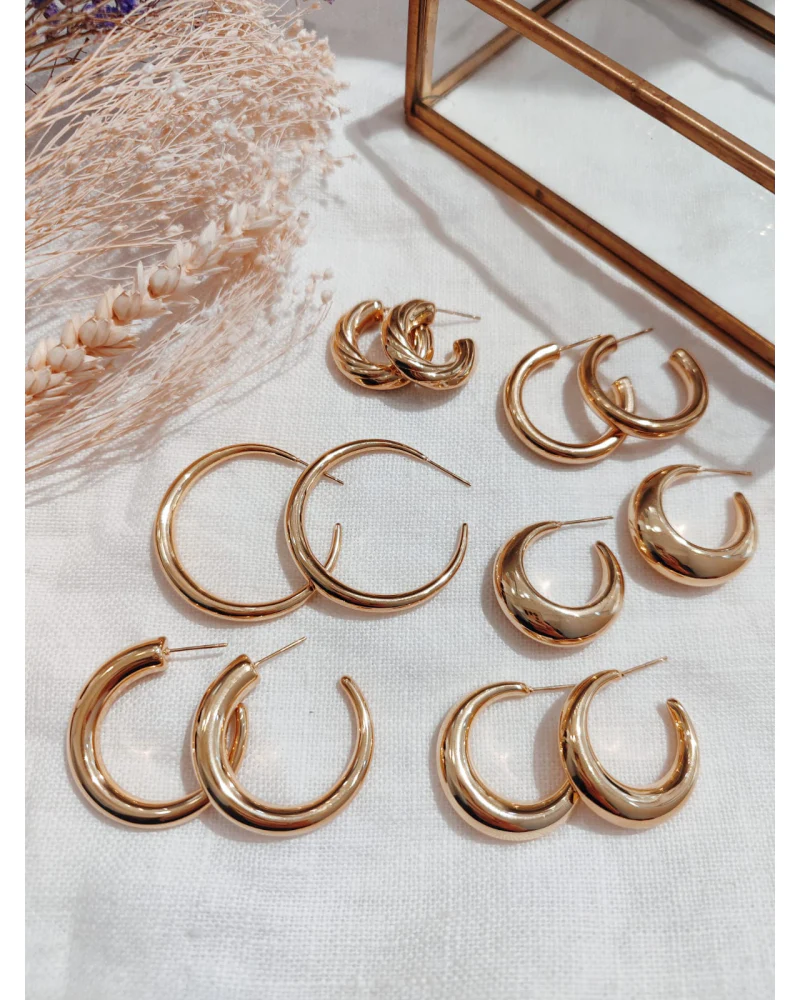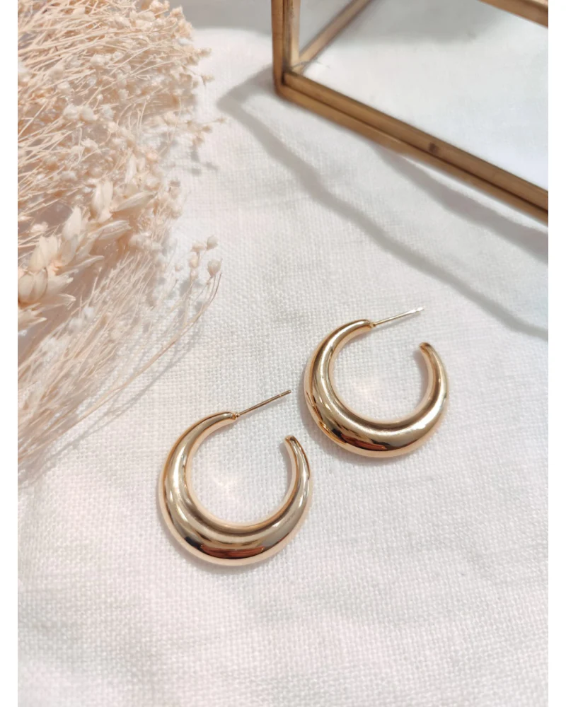 Fabriquées en acier inoxydable doré, elles ne ternissent pas et résistent à l’eau, garantissant un éclat durable. Légères et agréables à porter, elles offrent une brillance sophistiquée tout en restant confortables, quelle que soit la taille choisie.