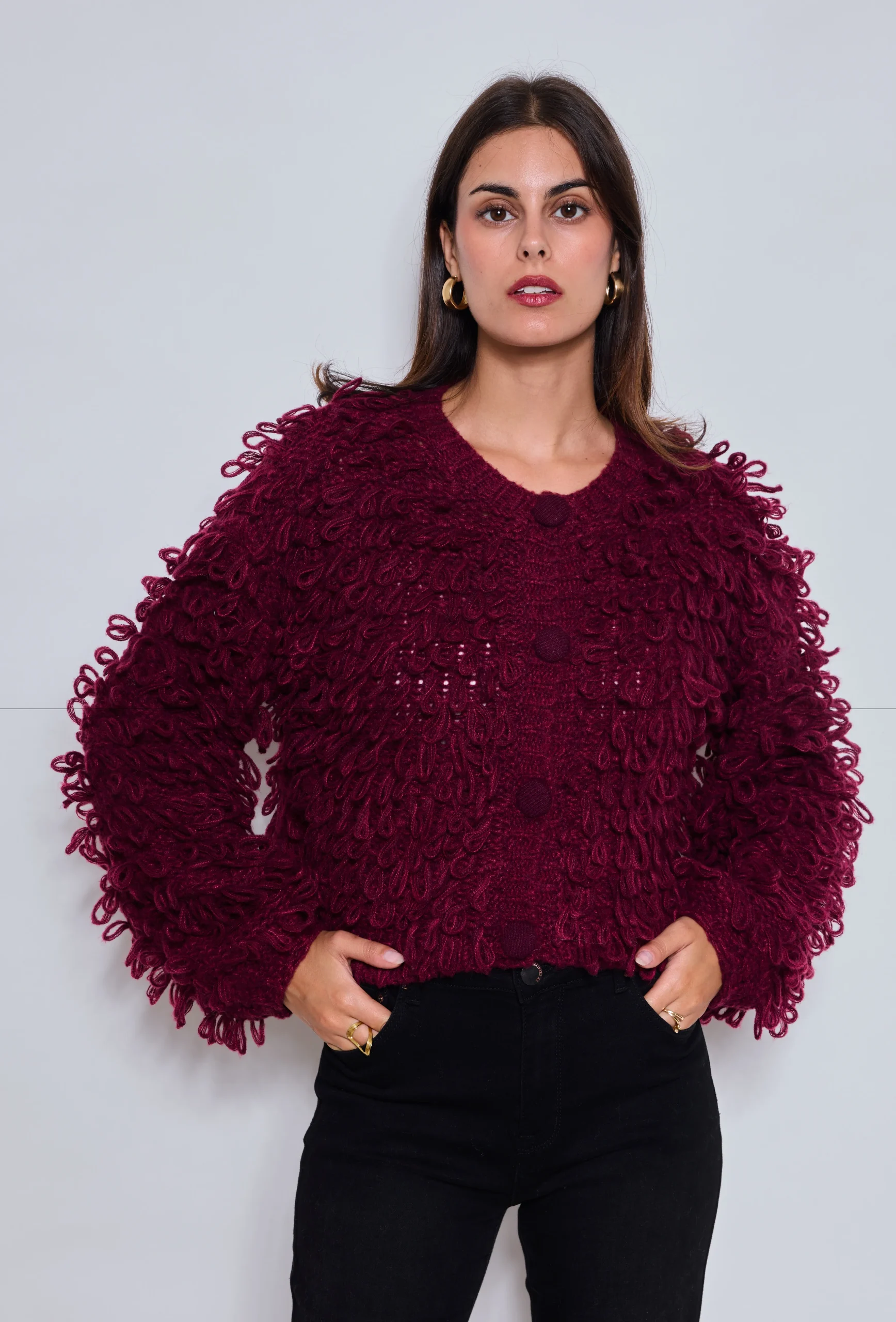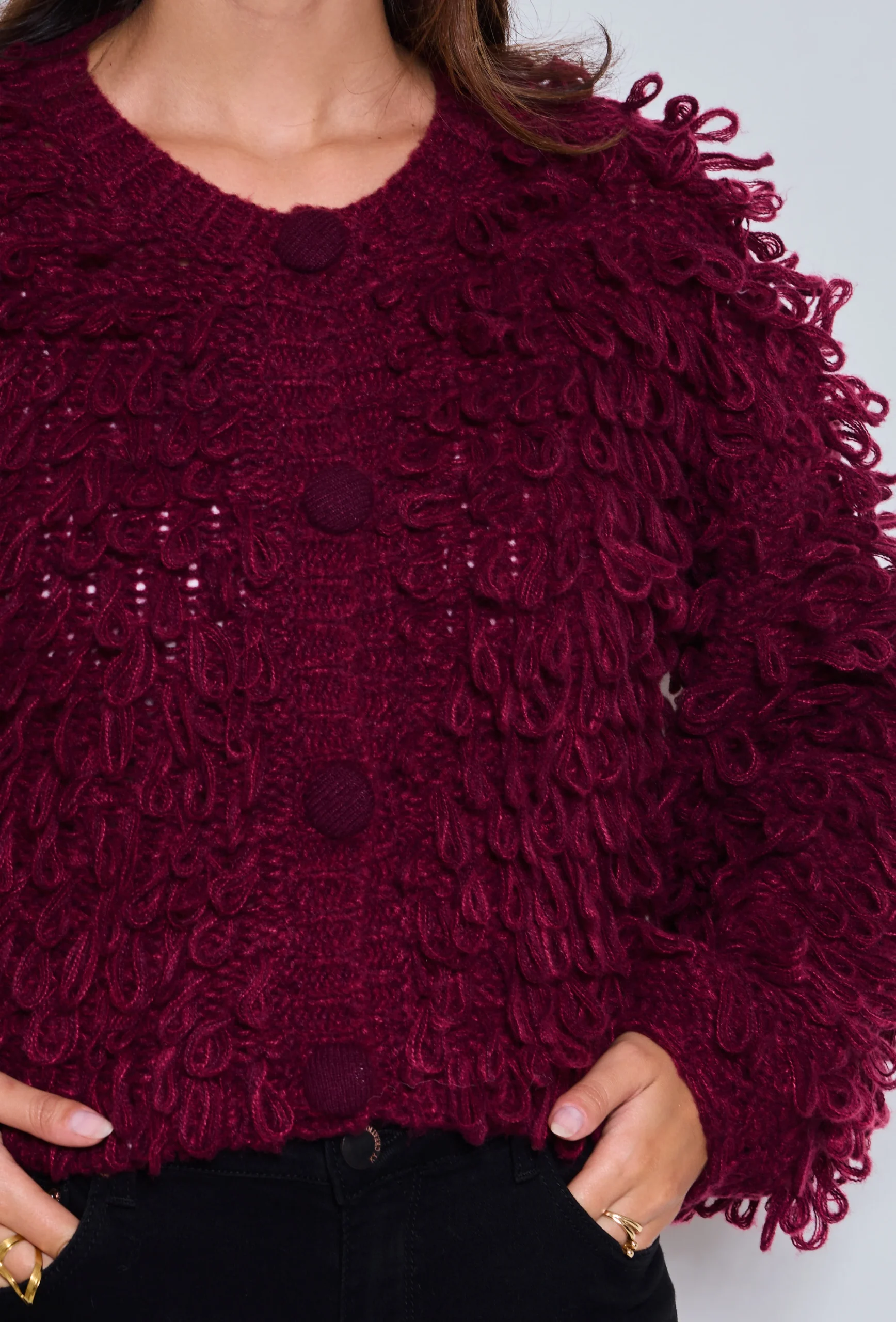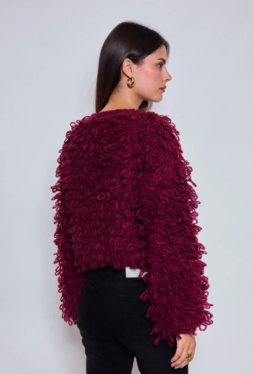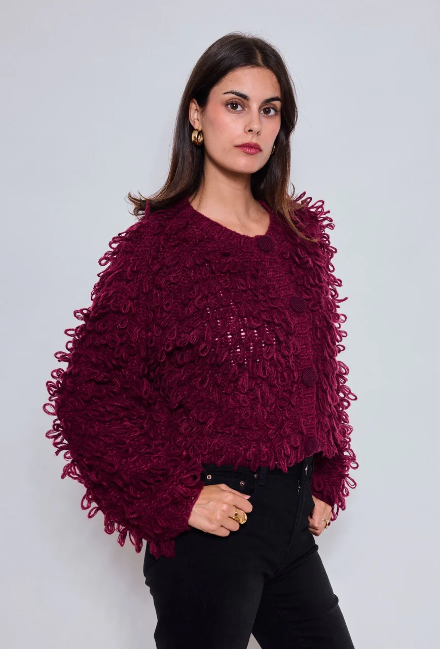 Ce gilet se distingue par ses bouclettes en relief qui lui donnent du volume et un style unique. Fermé par des boutons recouverts ton sur ton, il se porte aussi bien au quotidien qu’en soirée pour affirmer un look bohème chic et tendance. Sa teinte bordeaux profonde en fait une pièce forte et élégante de la saison automne-hiver.