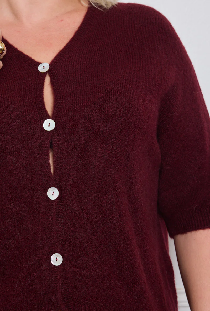 Ses manches courtes en font une pièce idéale pour la mi-saison ou les journées d’été un peu fraîches. Sa fermeture boutonnée avec de jolis boutons nacrés apporte une touche raffinée, tandis que ses coloris élégants – bordeaux profond et vert olive – permettent de varier les styles.