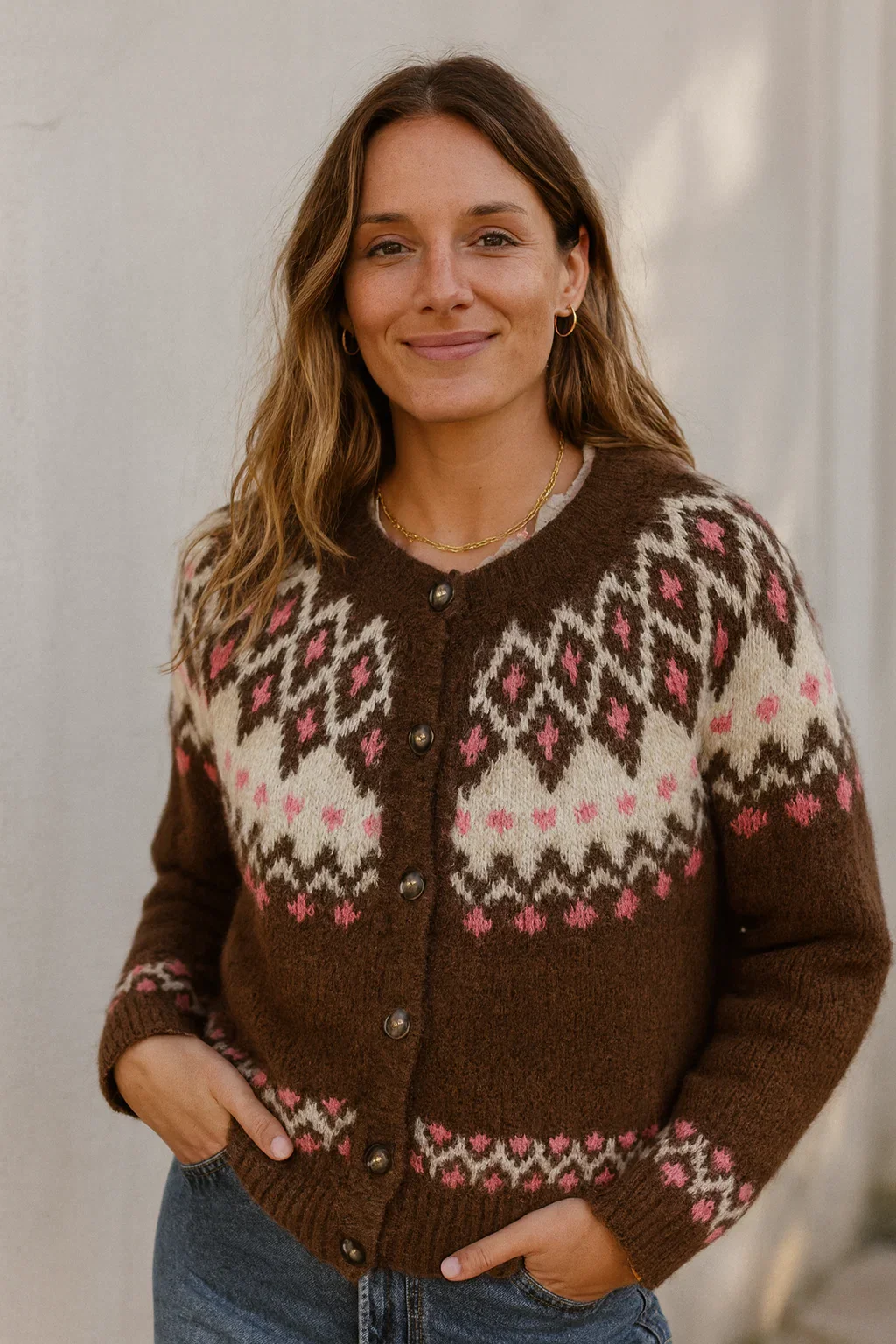 Mesdames, ce gilet jacquard est une pépite pour affronter l’hiver avec douceur et style. Ses couleurs chocolat, crème et rose apportent une ambiance chaleureuse et féminine, parfaite pour illuminer vos looks hivernaux.