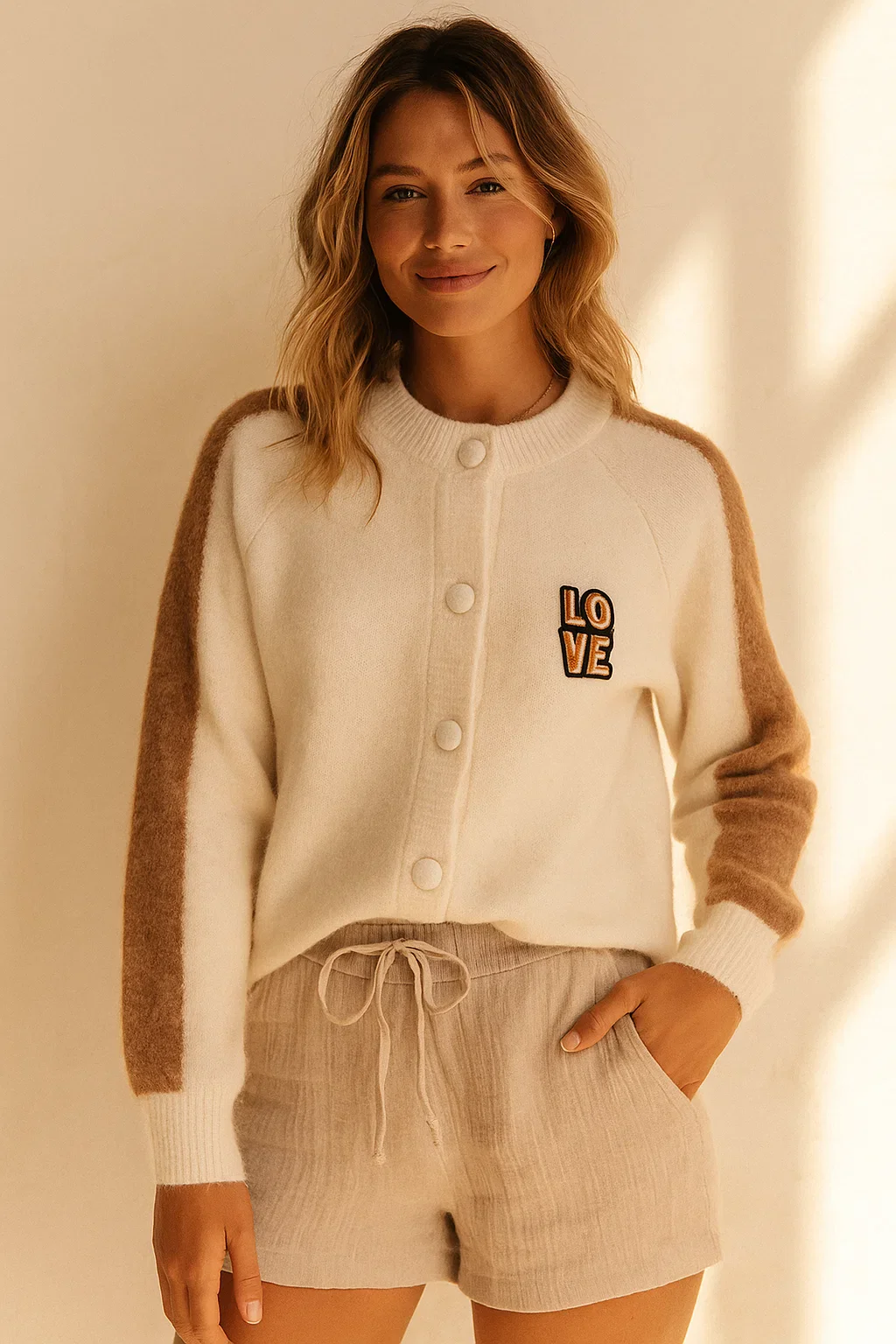 Ce gilet bicolore est la pièce parfaite pour allier confort et tendance dans vos looks du quotidien. Conçu dans une maille douce et extensible, il associe un coloris crème élégant à des manches contrastées camel, rehaussé d’un détail LOVE brodé sur la poitrine pour une touche bohème chic.