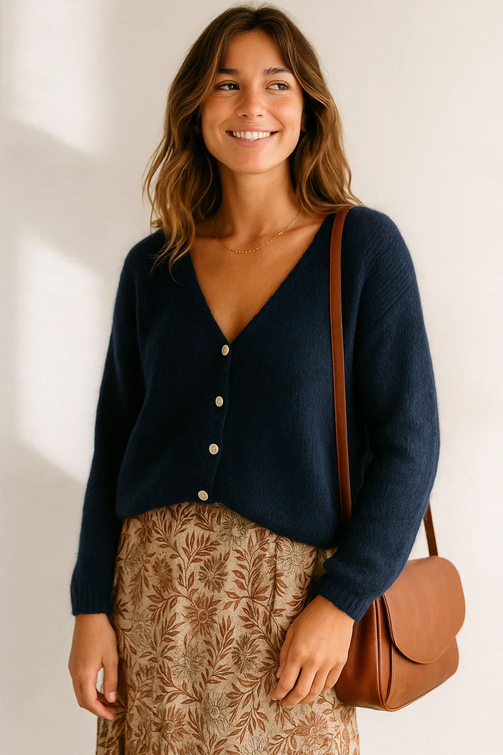 Féminin et confortable, ce gilet se ferme par de jolis boutons nacrés pour un look à la fois décontracté et raffiné. Parfait à porter à même la peau ou sur un tee-shirt basique, il se glisse dans un jean, une jupe fluide ou un pantalon taille haute pour un style bohème chic moderne.