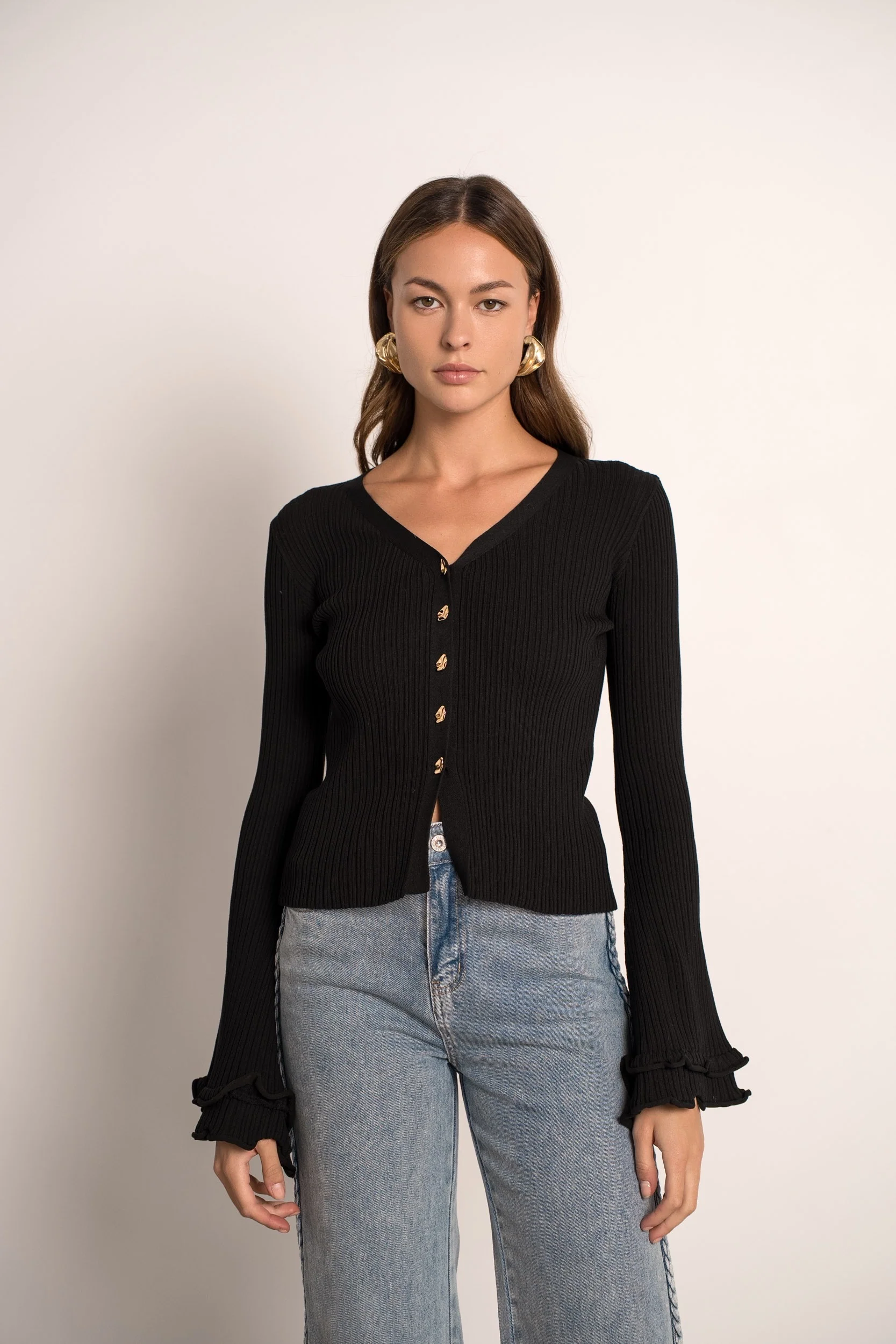 Ses manches longues évasées à volants apportent une touche d’originalité et de mouvement, idéale pour celles qui aiment un style chic et bohème. Les boutons dorés ajoutent une finition raffinée qui contraste élégamment avec le noir profond de la maille. Léger et agréable à porter, ce gilet en viscose est idéal pour la mi-saison ou pour superposer sur un haut plus léger.