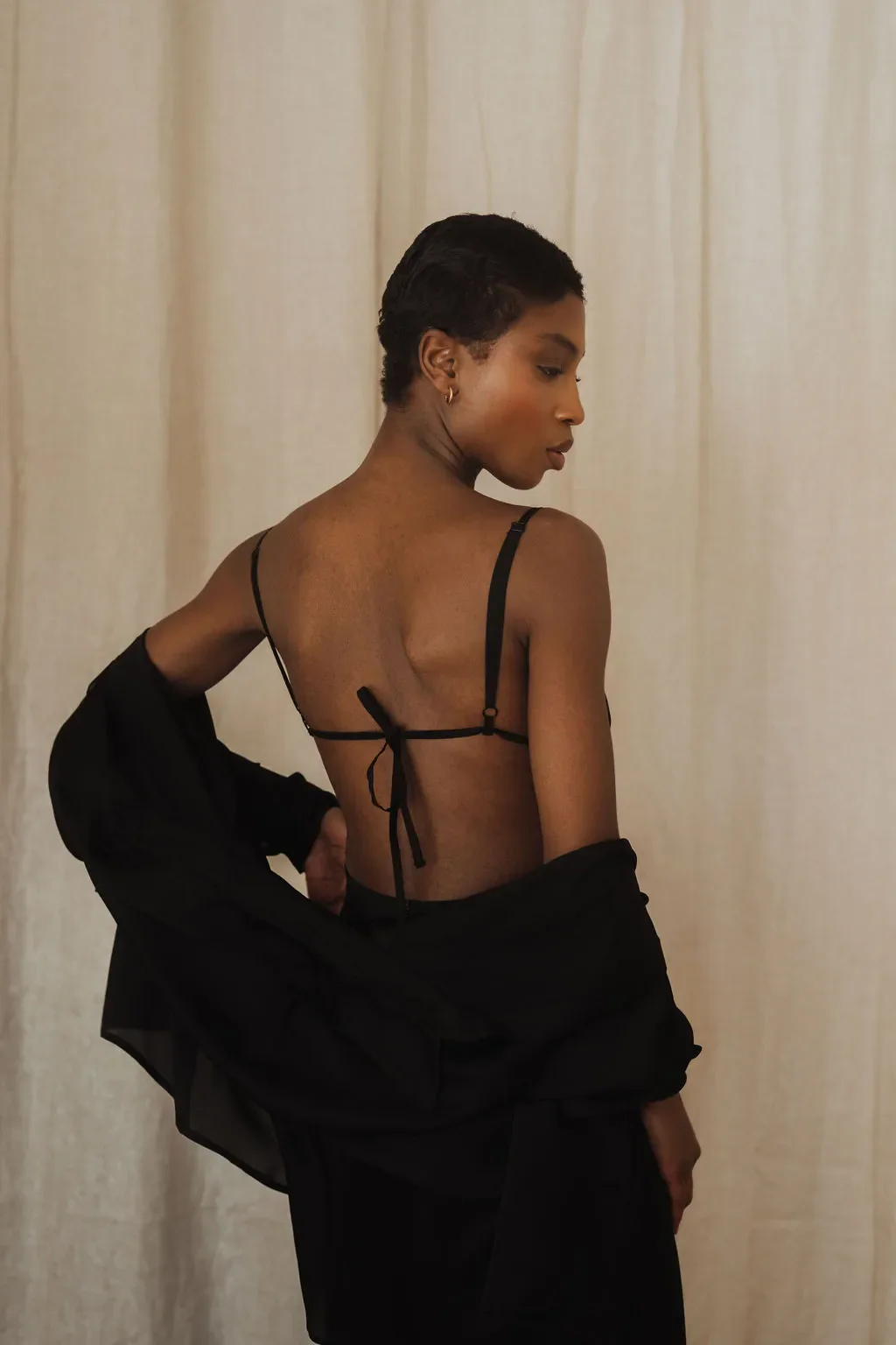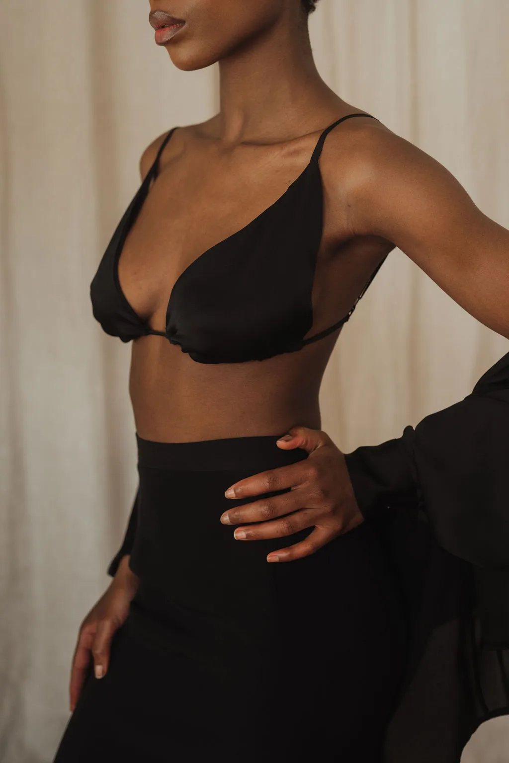Haut noir en Soie, coupe triangle, simple mais sublime. 100 % charmeuse de de soie légèrement brillante et fluide.