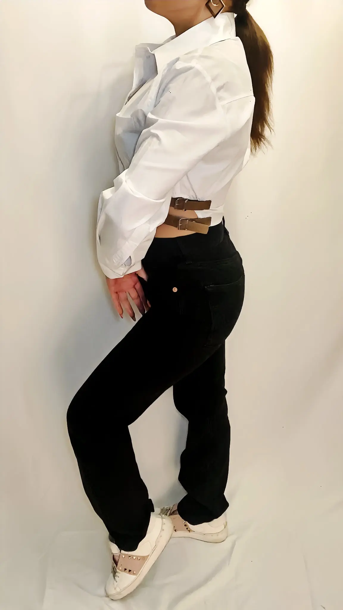 Tissu en coton de style jean. Tissu en coton organique recyclé mélangé. Coupe droite. Taille normale, prenez votre taille habituelle. Bracelet de cheville. Passants pour la ceinture. Cinq poches. Fermeture boutonnée. Taille plus grande que d’habitude.