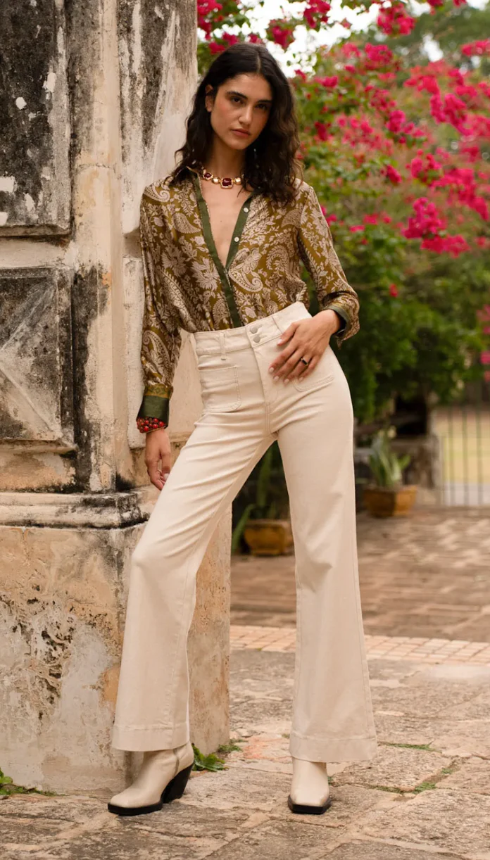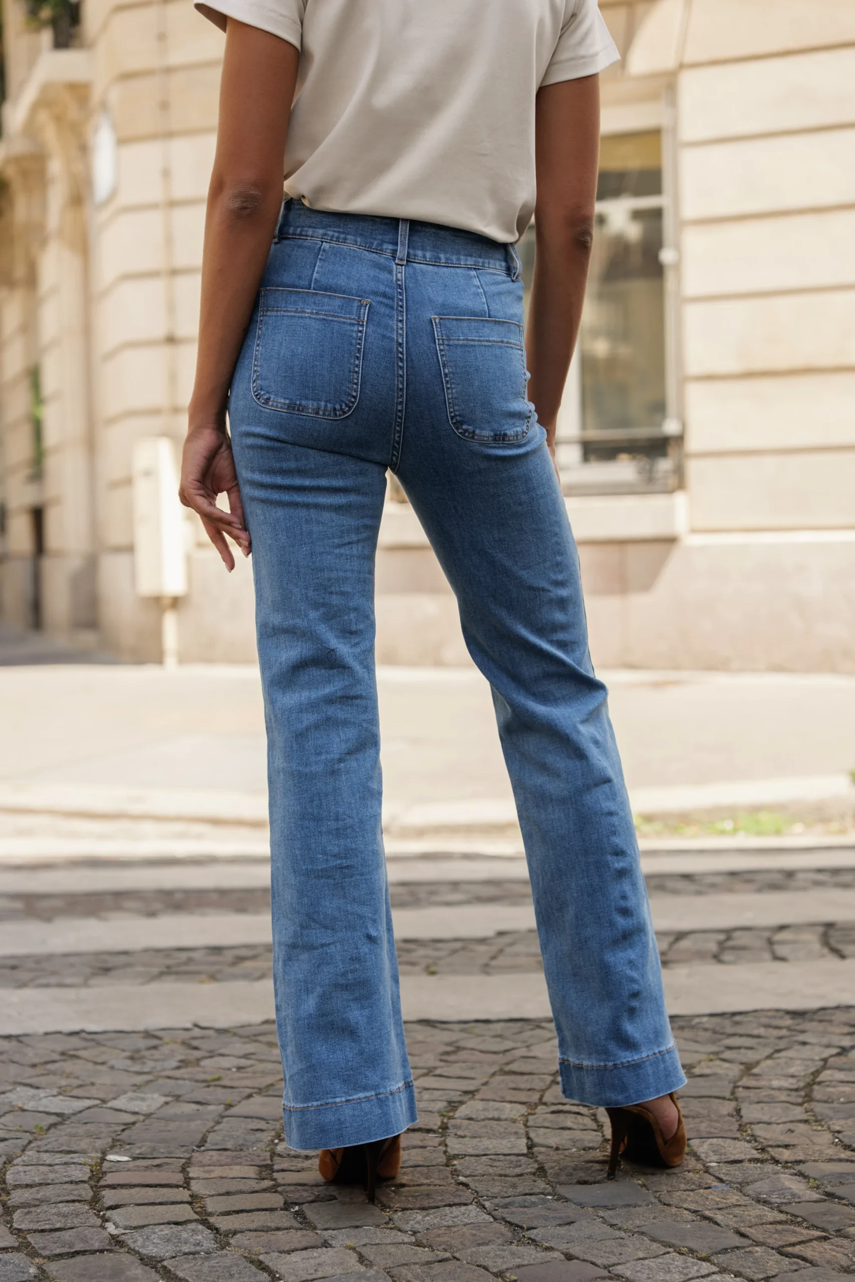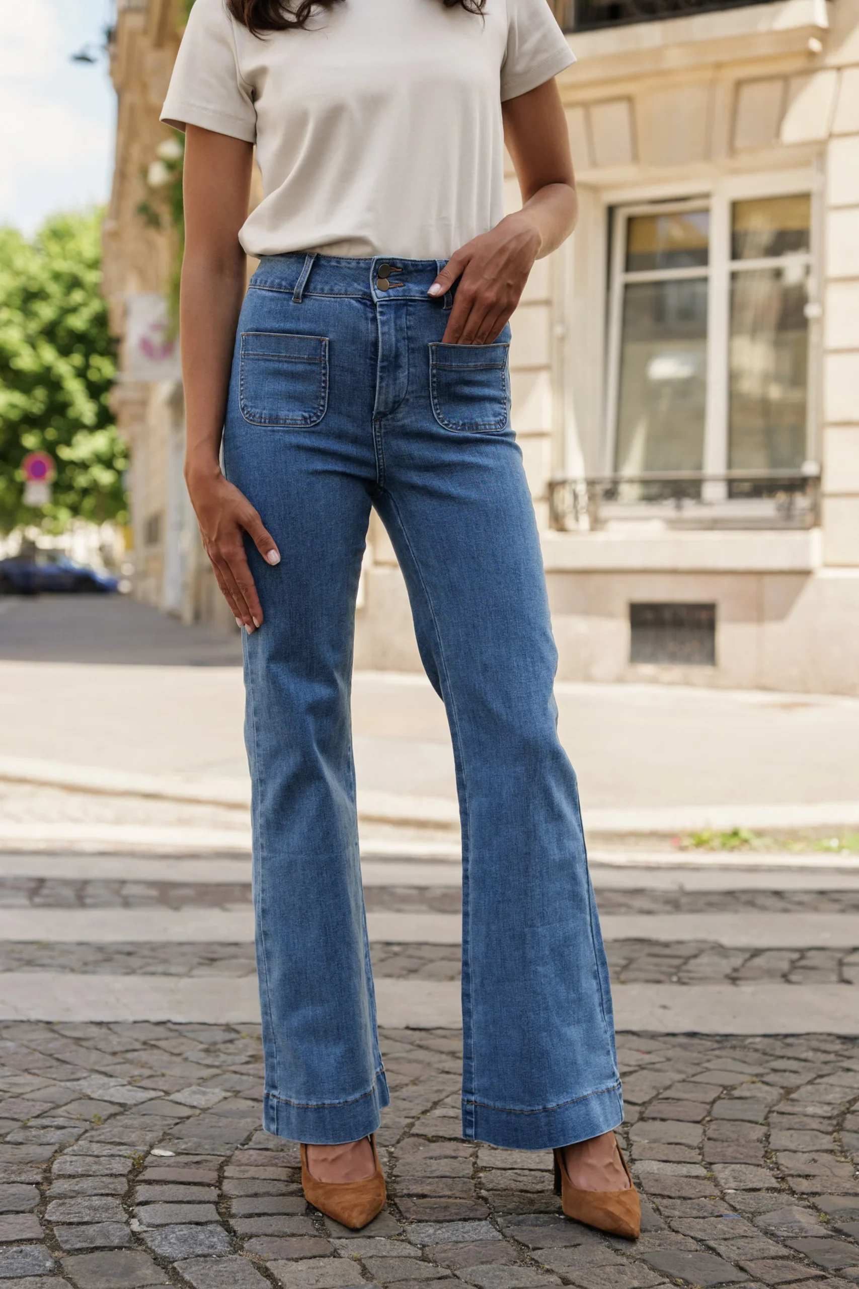Ce jean highwaist large flare en denim foncé est un véritable incontournable pour une silhouette allongée et élégante. Sa coupe taille haute et son évasement à partir du genou apportent un style rétro-chic qui souligne la taille tout en offrant une grande liberté de mouvement. Composé à 99 % de coton, il offre confort et respirabilité, avec une légère touche d’élasthanne (1 %) pour épouser délicatement les courbes sans sacrifier la mobilité. Il est disponible dans les tailles du 34 au 42, pour s’adapter à de nombreuses morphologies.