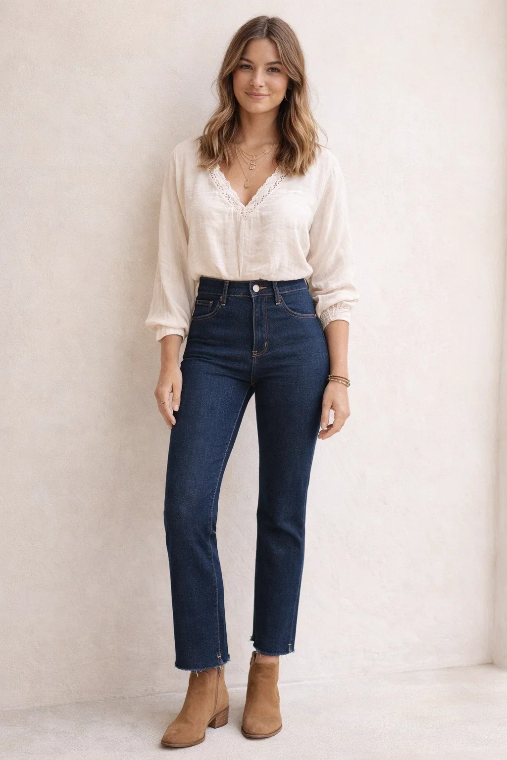 Le denim bleu brut apporte une touche chic et intemporelle, parfaite aussi bien en journée qu’en soirée. Les détails comme les poches arrière travaillées et les surpiqûres contrastées soulignent son style authentique.