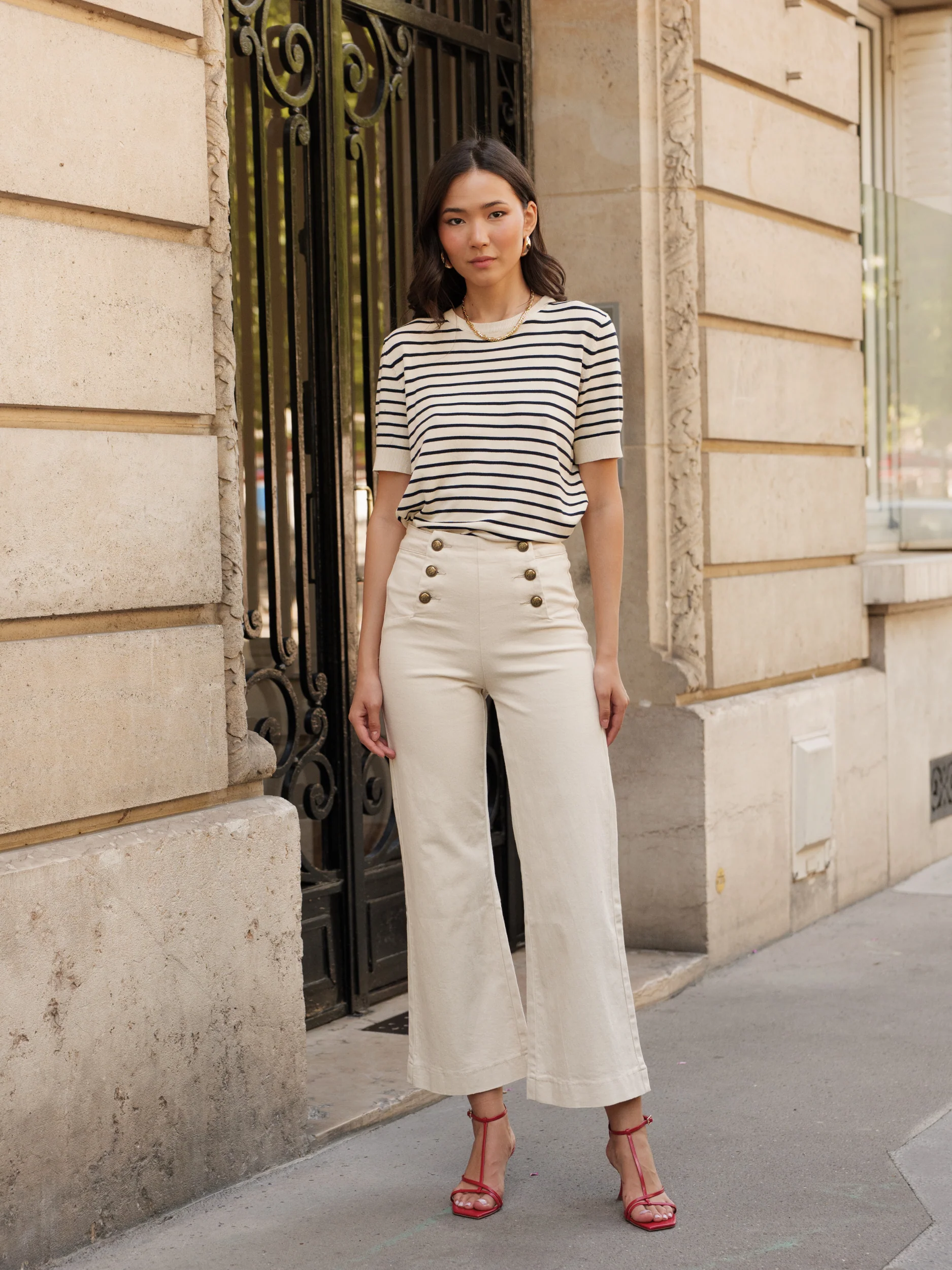 Ce jean se distingue par sa taille haute ajustée et sa jambe évasée cropped qui met en valeur la silhouette tout en offrant une grande liberté de mouvement. Les boutons dorés décoratifs ajoutent une touche chic et originale. Sa teinte écrue claire en fait une pièce lumineuse et facile à assortir.