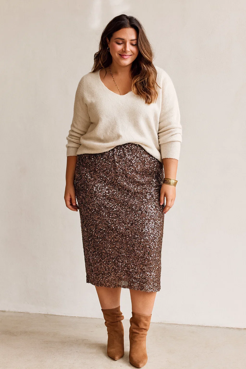 Chère cliente, cette jupe en sequins est la pièce idéale si vous aimez vous sentir élégante et lumineuse sans renoncer au confort. Conçue en taille unique du 44 au 50, elle offre une coupe droite flatteuse et une taille élastique qui s’adapte parfaitement à votre silhouette. Les sequins, répartis sur toute la surface, apportent une brillance délicate et sophistiquée qui capte la lumière avec élégance.