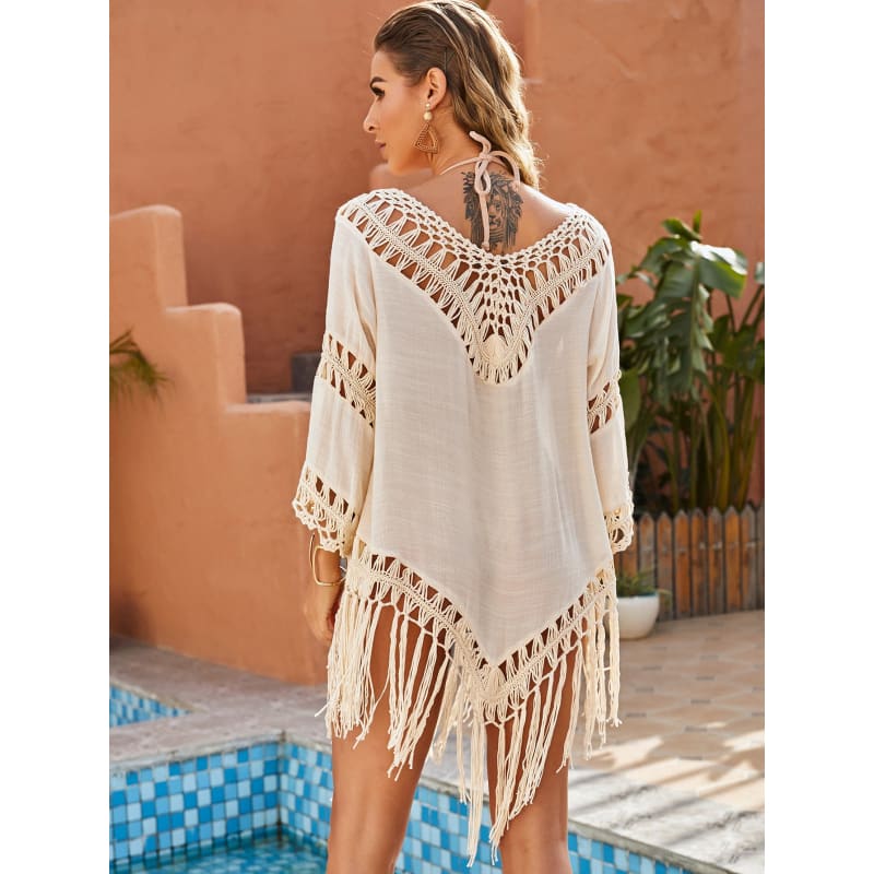 Superbe kimono blanc transparent avec dentelle. Une belle manche ample trois quarts et une fermeture sur l’avant par cordon et des floches dans le bas. C’est agréable de ressentir le vent caresser la peau.